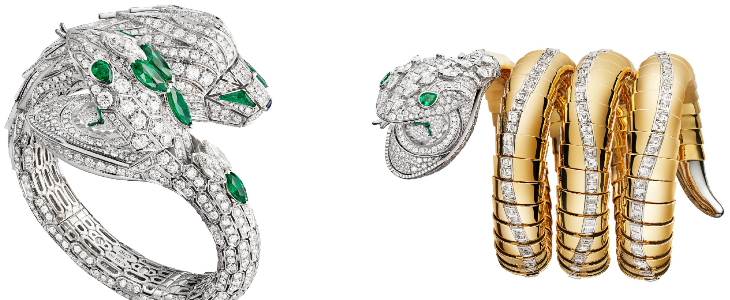Concludiamo con la collezione Serpenti misteriosi: i due bracciali, Chimera e Dragone sono in oro bianco e oro giallo. A differenza di ciò che normalmente accade nei segnatempo d’alta orologeria che custodiscono movimenti al quarzo, Bvlgari ha inserito nelle teste dei serpenti il Micromovimento meccanico di manifattura Piccolissimo a carica manuale, riserva di carica di 30 ore. Su entrambi i quadranti diamanti a pavé (0,28 ct), lancette verdi e vetro zaffiro sfaccettato.