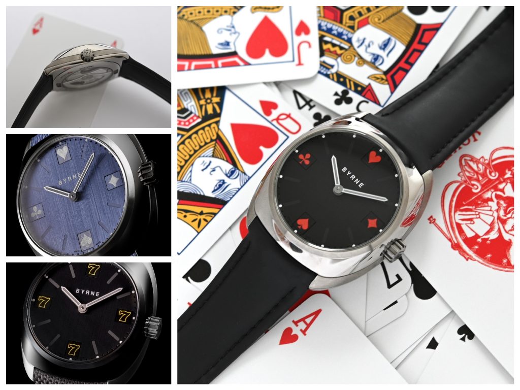 Two novelties with Gyro-dial have been realized by Byrne Watches choosing the suits of playing cards: hearts, diamonds, clubs, spades, according to Casinò playing.