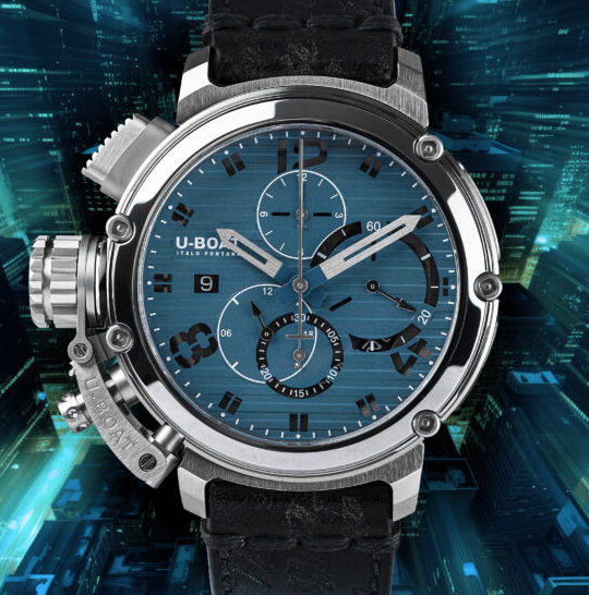 Tornando a parlare di orologi destinati agli sportivi, vogliamo ricordare gli U-Boat Chimera Stripse, presentati nello scorso Agosto a WandW: due in versione solo tempo e uno in versione cronografo. I solo tempo in acciaio AISI 316L, ø 46 mm w.r. a m.100, hanno il quadrante fumée e aperture laterali per vedere il movimento automatico ETA 2824 Top Soigné, il cronografo, con movimento Sellita SW500, la cui produzione ha poi subito un leggero ritardo arriva solo questo inverno, è disponibile in tirature limitate a 300 esemplari per colore (nero, verde, blu). Sono tutti personalizzati secondo le specifiche U-BOAT con rotore in ottone e tungsteno, decorazione a perlage e rodiatura dei ponti avvitati. Sulla cassa a sinistra il pulsante brevettato che facilita l’estrazione della corona protetta.