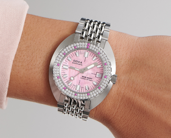 Restando qui nel campo che più ci compete, diciamo che ci ha un po’ stupito l’abbinamento dei Doxa sub ai diamanti (nella foto sopra), ma queste pietre fanno parte dell’immaginario femminile, quindi ben vengano anche i Doxa Sub200T Diamonds proposti in sette diversi modelli con casse ø 39 mm, w.r. a m.200, e quadranti neri sette colori iconici della Maison, più quello della foto, il Rosa Dream. Le lunette sono incastonate di. diamanti e gemme colorate, il movimento svizzero è a carica automatica.