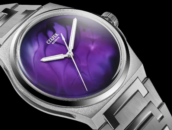 Czapek & C. infatti ha lanciato a Hong Kong ii 20 Novembre 2024, l’Antarctic Purple Strom che completa le precedenti edizioni in diversi colori; questa, limitata a 18 esemplari è disponibile come pre-ordine online sul sito dell’azienda ginevrina. Per ora abbiamo ammirato il quadrante verniciato a mano dallo specialista Metalem, vera sinfonia cromatica del viola, un colore misterioso che a seconda della luce, rivela tonalità diverse. Il movimento automatico è il Calibro SXH5 di Manifattura con microrotore in platino riciclato.