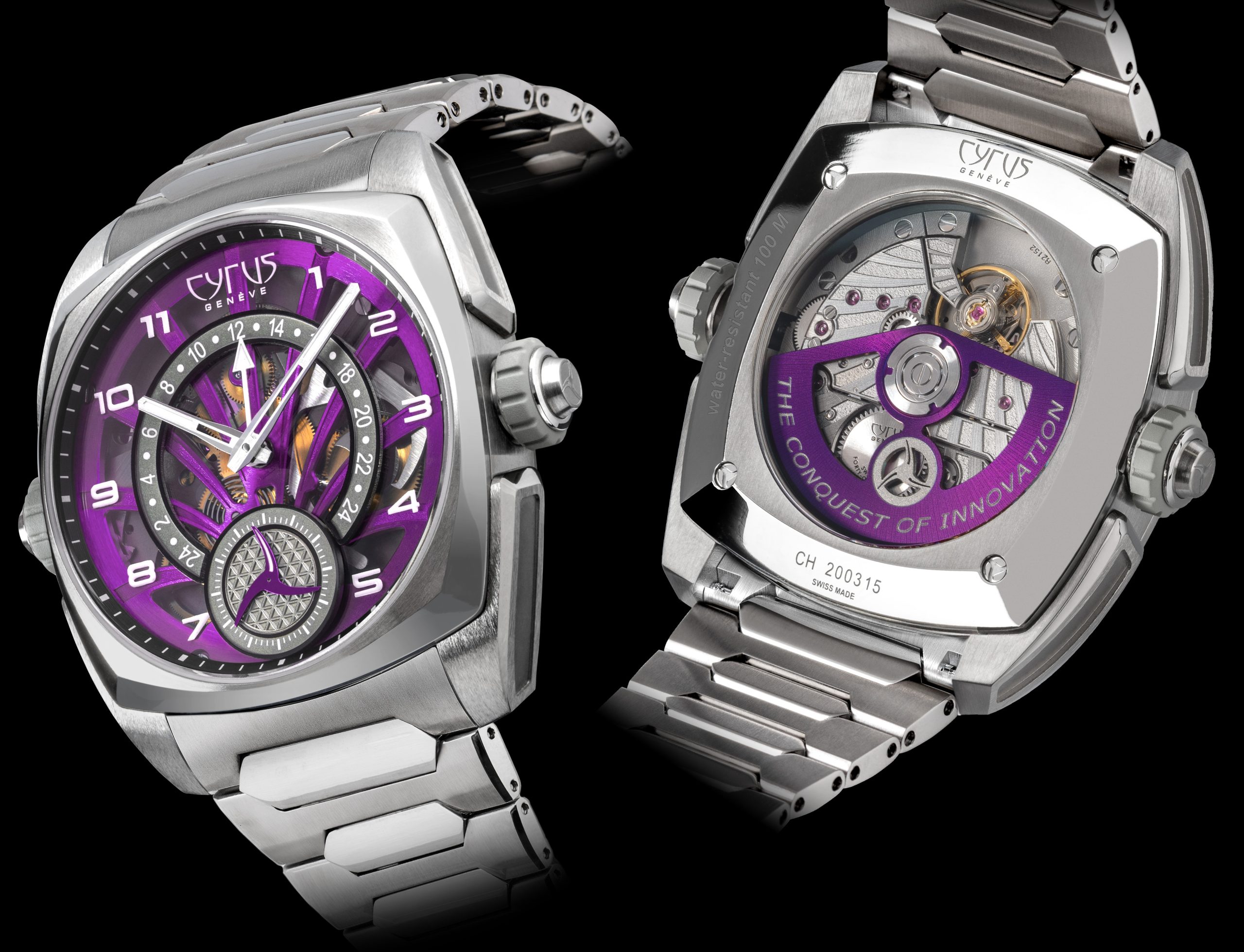 Il quadrante tridimensionale traforato fa risaltare l’originale ponte superiore del movimento a forma di palma, dal quale si intravedono il movimento e un semiarco per l’indicazione del secondo fuso orario retrogrado sulle 24 ore. La cassa a cuscino, in titanio grado 5 lucido/satinato ha un diametro di 42 mm, spessore mm 13,9 ed è w.r. a m.100; dal fondo si ammira la massa oscillante traforata e nello stesso colore del quadrante Royal Purple, ottenuto con trattamento ALD (Atomic Layer Deposition) tecnica di deposizione di strati atomici sotto vuoto che genera un rivestimento perfettamente uniforme e omogeneo, oltre a fornire una protezione superiore contro la corrosione. La decorazione a cerclage e bordi microbillé è alternata a raggi piatti opachi rifiniti al laser. Il colore crea un piacevole contrasto visivo con le ruote dentate placcate oro 4N, che il proprietario potrà ammirare in azione. Sul rehaut dei minuti grigio antracite, gli indici a intervalli di 5 minuti sono trattati con Super- LumiNova ad emissione di luce blu. La complicazione del doppio fuso orario di 24 ore è collocata al centro su un arco opaco grigio opalino bordato di grigio antracite. La lancetta retrograda a punta triangolare indica l’ora di casa con numeri arabi pari mescolati a indici tondi, entrambi luminescenti. A ore 6 il contatore dei piccoli secondi color grigio chiaro decorato con un motivo a triangolo, è impreziosito dall’esclusiva lancetta a forma di elica che richiama il logo. È della stessa tonalità del ponte superiore, con un’estremità luminosa che si accende al buio. Le due corone, con il logo inciso, per una miglior presa sono circondate da un anello in caucciù grigio, quella a ore 3 carica il movimento e imposta contemporaneamente sia l’ora principale sia il secondo fuso orario, una pressione sulla corona a ore 9 muove la lancetta dell’ora principale in avanti di un’ora ogni qual volta viene premuta. La lunetta tridimensionale ha una base quadrata con profili ed angoli curvi evidenziati da sfaccettature lucide combinate con la parte superiore satinata opaca e incornicia il vetro zaffiro antiriflesso. Le anse allungate che abbracciano la doppia corona hanno una finitura lucida /spazzolata, la stessa combinazione di lavorazioni si vede sull’anello del fondello, chiuso da quattro viti personalizzate con il simbolo di Cyrus, l’elica. Infine il movimento automatico di Manifattura calibro CYR708, progettato da Jean-François Mojon con il suo team di orologiai nell’azienda a Le Locle ha un organo regolatore a 28.800 alternanze orarie (3 Hz) che garantisce una riserva di carica di 55 ore fornita da un unico bariletto, sulla massa oscillante monoblocco traforata il logo della Casa e ill motto inciso “The Conquest of Innovation”.