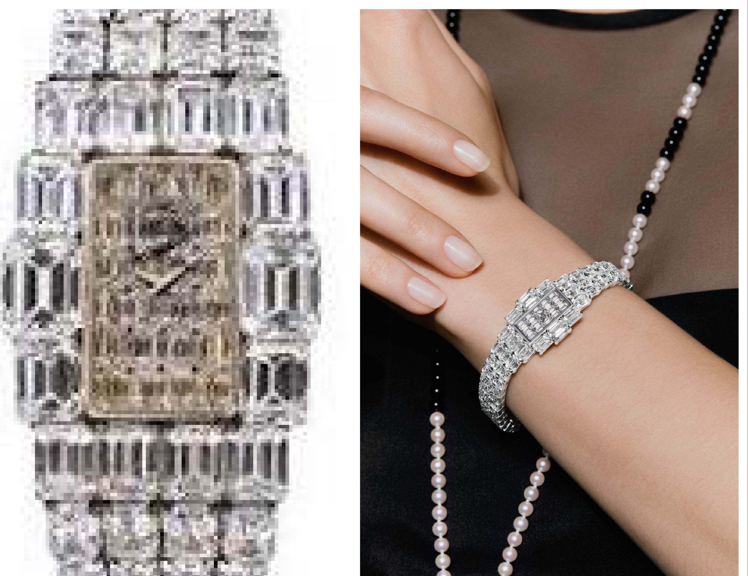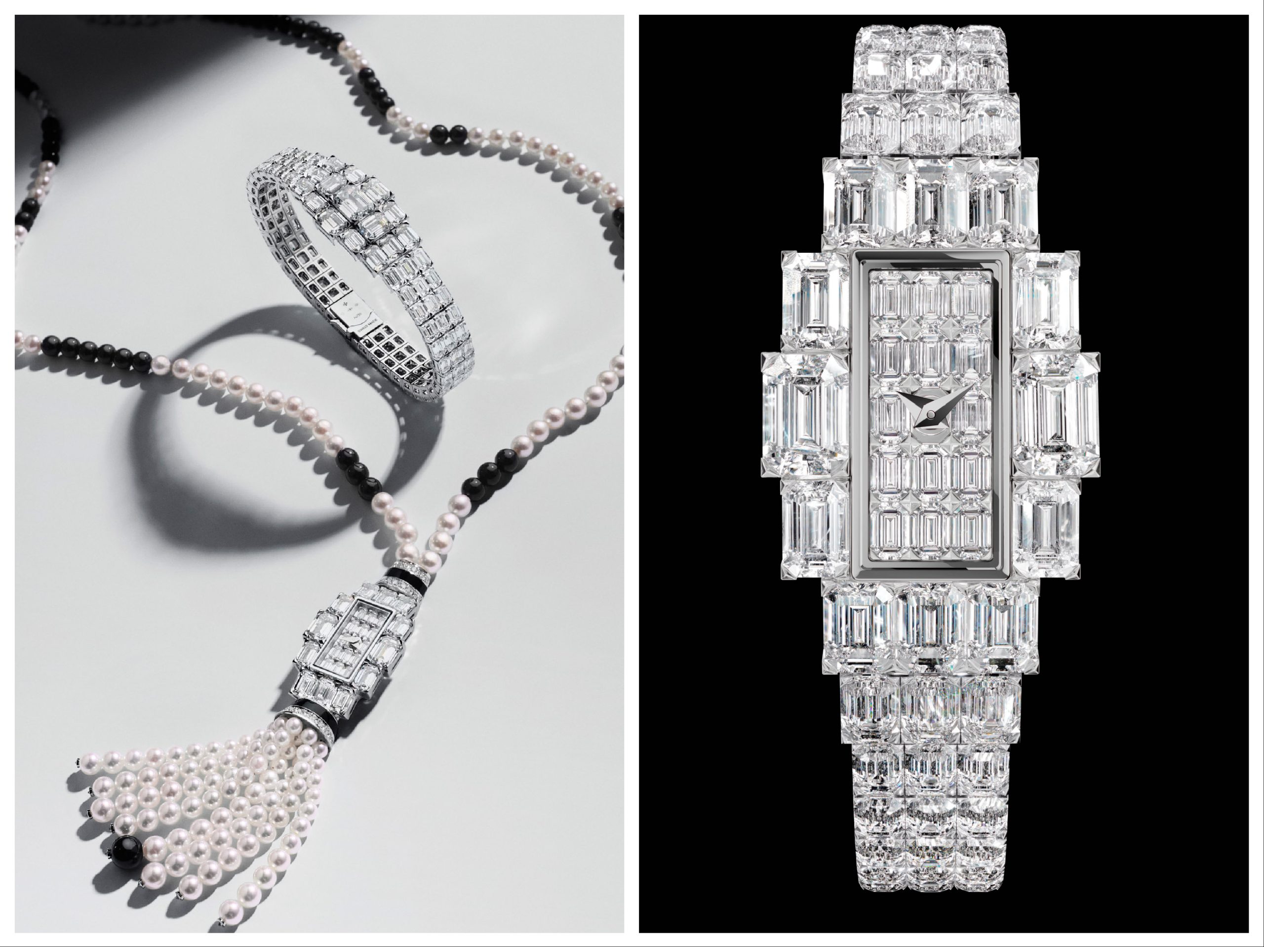Sulla cassa dell’orologio in oro bianco (ø 19,4 mm x 30,1 mm, 8,3 mm di spessore) sono incastonati a griffe 12 diamanti taglio smeraldo per 6,90 carati; il quadrante ne incastona 14 e il bracciale 105, per un totale complessivo di oltre 30 carati. Venduto solo nelle boutique della Maison ginevrina che ne svela il prezzo a richiesta.
