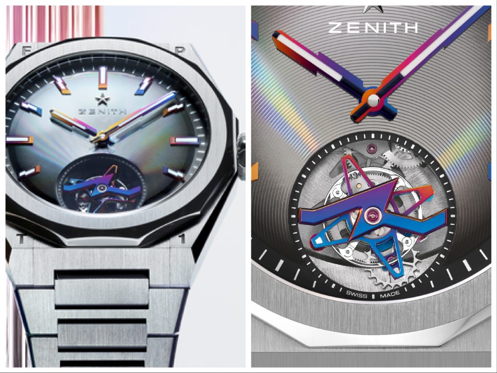 La cassa in acciaio ø 41 mm con lunetta sfaccettata vede, protetto dal vetro zaffiro con motivo microinciso ed elementi con finitura PVD arcobaleno, il quadrante disegnato da Felipe Pantone. Il famoso artista moderno, nato in Argentina, ma cresciuto in Spagna è noto per le sue opere cinetiche. Ha già collaborato con Zenith ideando il Defy Extreme, oggi in questo orologio, oltre a scelte cromatiche con dettagli sfumati e tinte iridescenti, si è soffermato sullo scappamento a tourbillon con il ponte a forma di saetta e la gabbia che ruota in 60 secondi a forma di stella. Due simboli ispirati alla velocità del movimento le cui A/h sono 36.000 e all’iconica stella di Zenith. Il movimento automatico di Manifattura ad alta frequenza è il Calibro El Primero 3630 la cui carica è di 60 ore. Il bracciale in acciaio satinato come la lunetta, è intercambiabile con il cinturino in caucciù nero, completando questo modello che farà la gioia dei cento collezionisti che lo acquisteranno (disponendo, per soddisfare la propria passione, di 65 mila Euro).