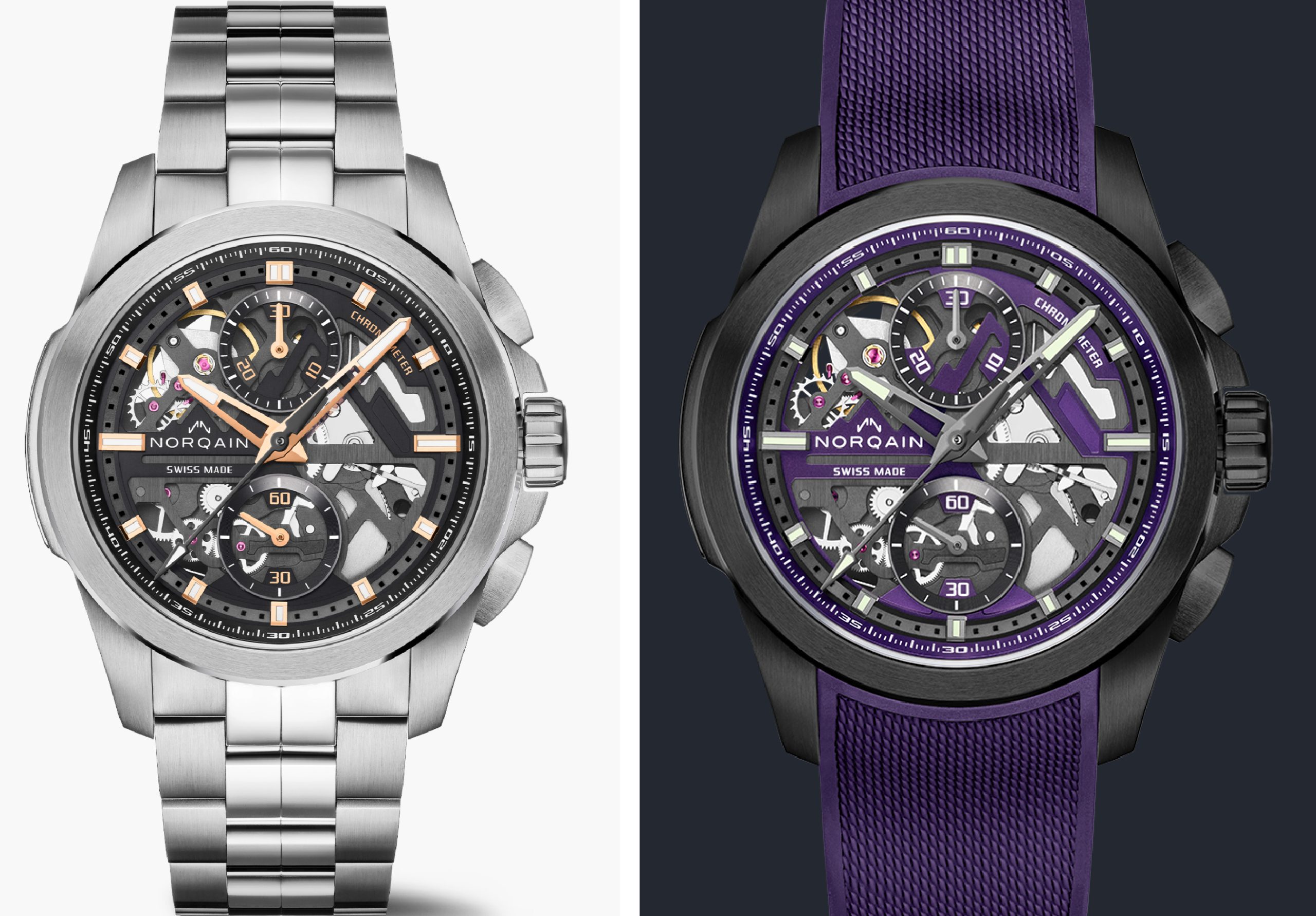 La versione in acciaio con quadrante scheletrato nero, finitura satinata, dettagli placcati in oro, lancette e indici luminescenti, viene fornita con un bracciale in acciaio inossidabile a quattro maglie. La sua disponibilità è limitata solo dalla produzione dei movimenti; Norqain infatti ha commissionato la prima volta 600 Calibri 8K, mentre un secondo lotto è stato previsto in tempo per Watches and Wonders Geneva 2025.