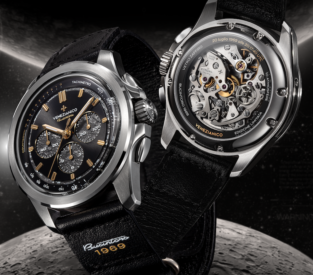 Dedicato all’impresa nello spazio che nel 1969 portò l’uomo sulla luna con la missione Apollo 11; il nuovo orologio non è solo un carica manuale, ma ha addirittura un Calibro Lemania 1873 come quello dell’Omega al polso degli astronauti. Restaurato dai tecnici di Venezianico, oggi è tornato a scandire il tempo cronografico in una cassa in acciaio con fondo a vista e cinturino logato. Anche altri dettagli come gli indici dorati e le analoghe lancette sul quadrante nero multilivello, protetto dal cristallo di zaffiro, ricordano quella missione con una grafica lunare, così come la seconda scala tachimetrica tarata T-60 sul tempo scandito a Cape Canaveral durante il coundown del pre-lancio, a T-5 e infine al Lancio alla fine del countdown, scala che si affianca ad una attuale a T-10 con il cronografo che resettato, torna ad essere attuale. L’edizione è limitata a 69 esemplari numerati su una placchetta applicata alla carrure.