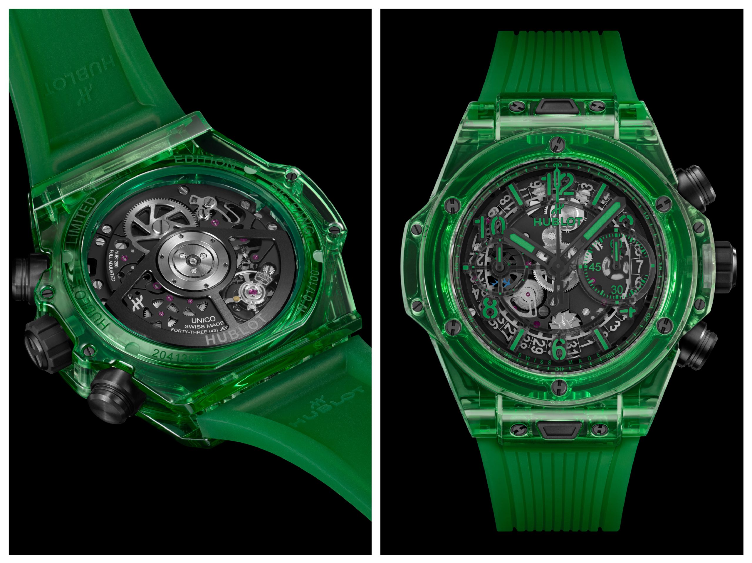 La lega SAXEM impiegata per la cassa ø 42 mm in zaffiro, per la lunetta, il fondello e la corona, era già stata presentata nel 2019 per il Big Bang MP-11; il colore giallo era altrettanto trasparente, ma di minor impatto cromatico. Ricordiamo che l’ossido di alluminio componente basilare dello zaffiro, unito a elementi di terre rare (tulio, olmio e cromo) origina un materiale ultra resistente, traslucido, molto più brillante dello stesso zaffiro, con minor tensione interna essendo più uniforme, omogeneo e compatto. È il risultato di studi ed esperimenti a livello di Istituti universitari ai quali si affiancano i reparti R&D delle aziende orologiere, ma non è l’unico elemento a fare del cronografo Big Bang Unico un esemplare ambito ai collezionisti. Infatti la tiratura è stata limitata a cento esemplari.