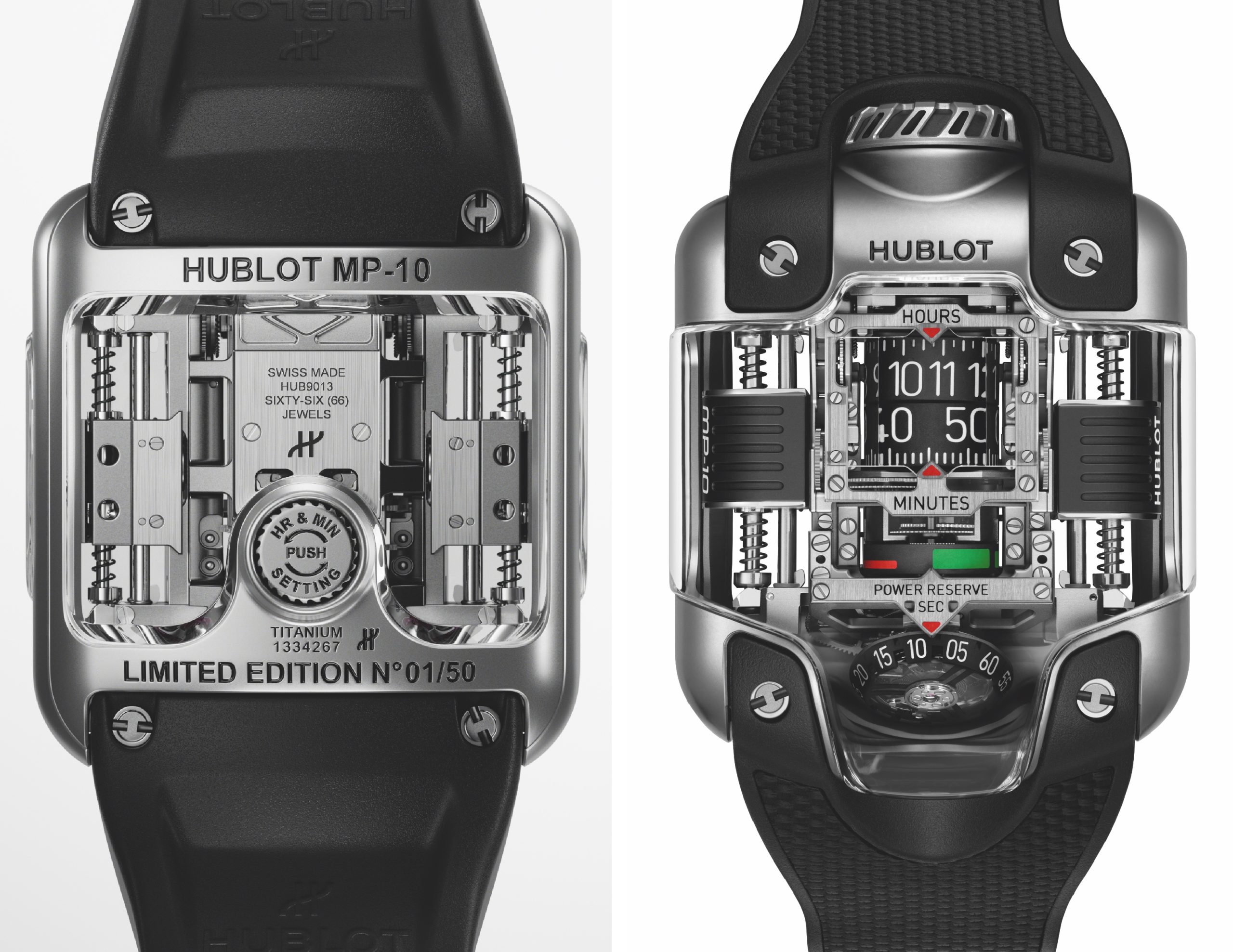 Realizzato in 50 esemplari numerati, il nuovo MP 10 ha una cassa in titanio micropallinato con fondo trasparente (queste le misure: mm 41,5 x 54,1, spessore mm 22, w.r.a m.30) e angoli smussati. La corona a ore 12 serve per la carica, quella sul retro per la messa all’ora. il design mette in mostra, sotto il cristallo di zaffiro, anche il movimento.