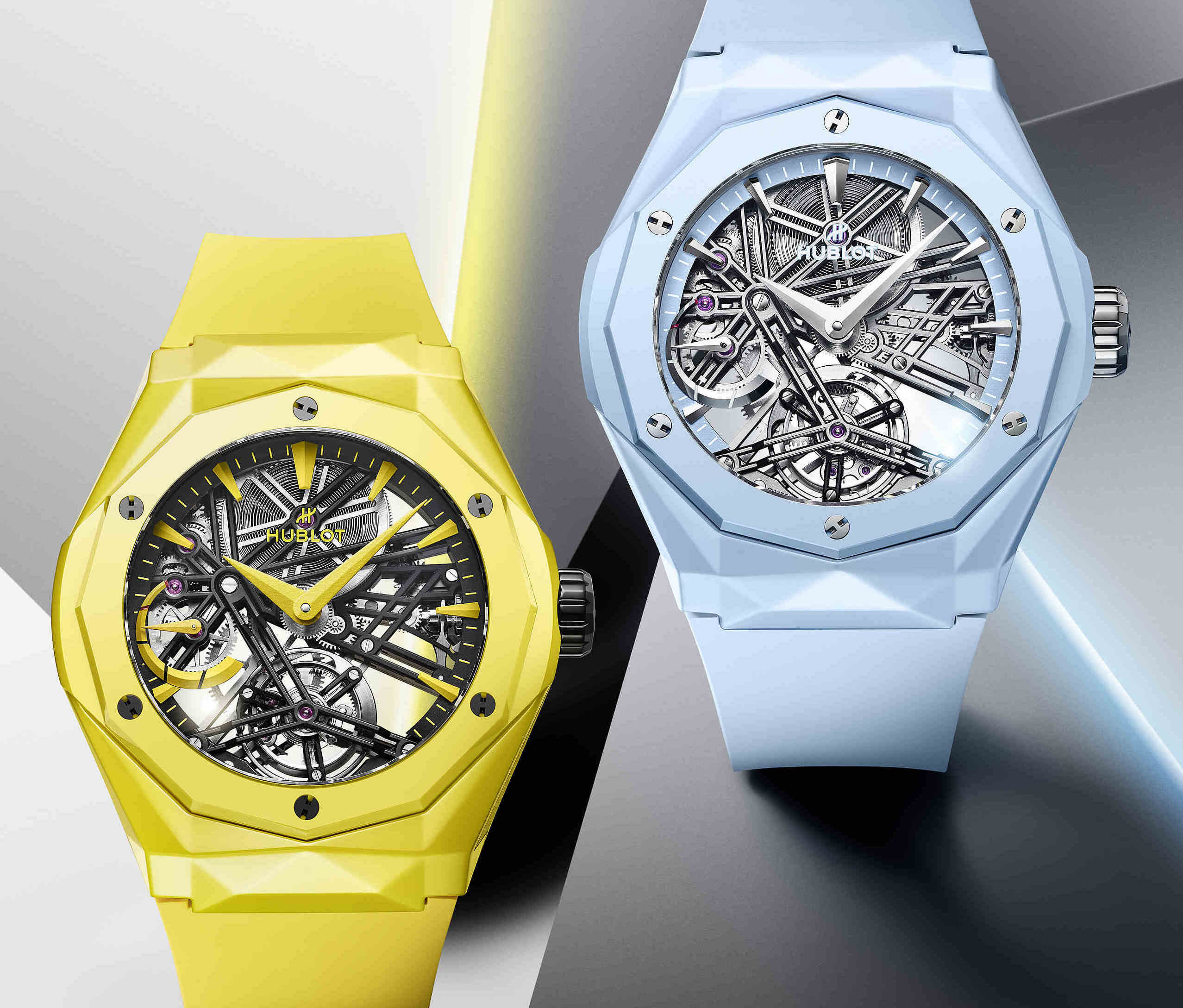 Continua la collaborazione con l’artista francese Richard Orlinski con nuovi Big Bang Classic Fusion Tourbillon Orlinski Ceramic. I colori scelti sono un giallo solare e un tenero azzurro che identificano ogni componente esterno del segnatempo (ma non le tradizionali viti a forma di H), gli indici e l’indicazione della riserva di carica (5 giorni) che si vede tra le 8 e le 9.