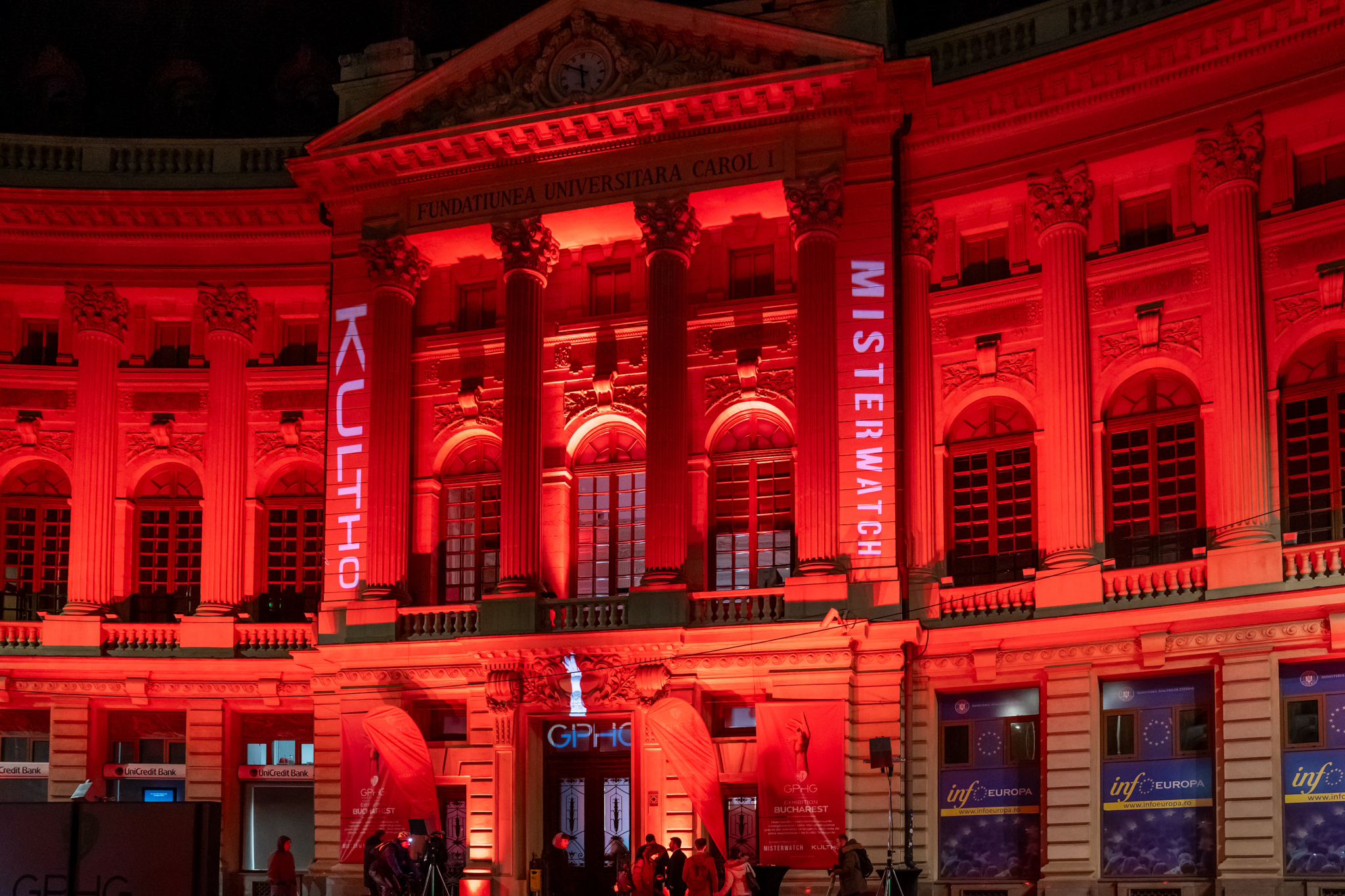 Sulla facciata del teatro spiccava la scritta “mister Watch”il Magazine che, con il supporto di Kultho ha organizzato, nella Bucarest University Library, l’esposizione. Dopo la serata dedicata ai Vip sono seguiti due giorni in cui il pubblico è stato ammesso nella Libreria dell’Università e sono state registrate più di millecinquecento presenze per questa presentazione che per la prima volta si è tenuta nell’est Europa.