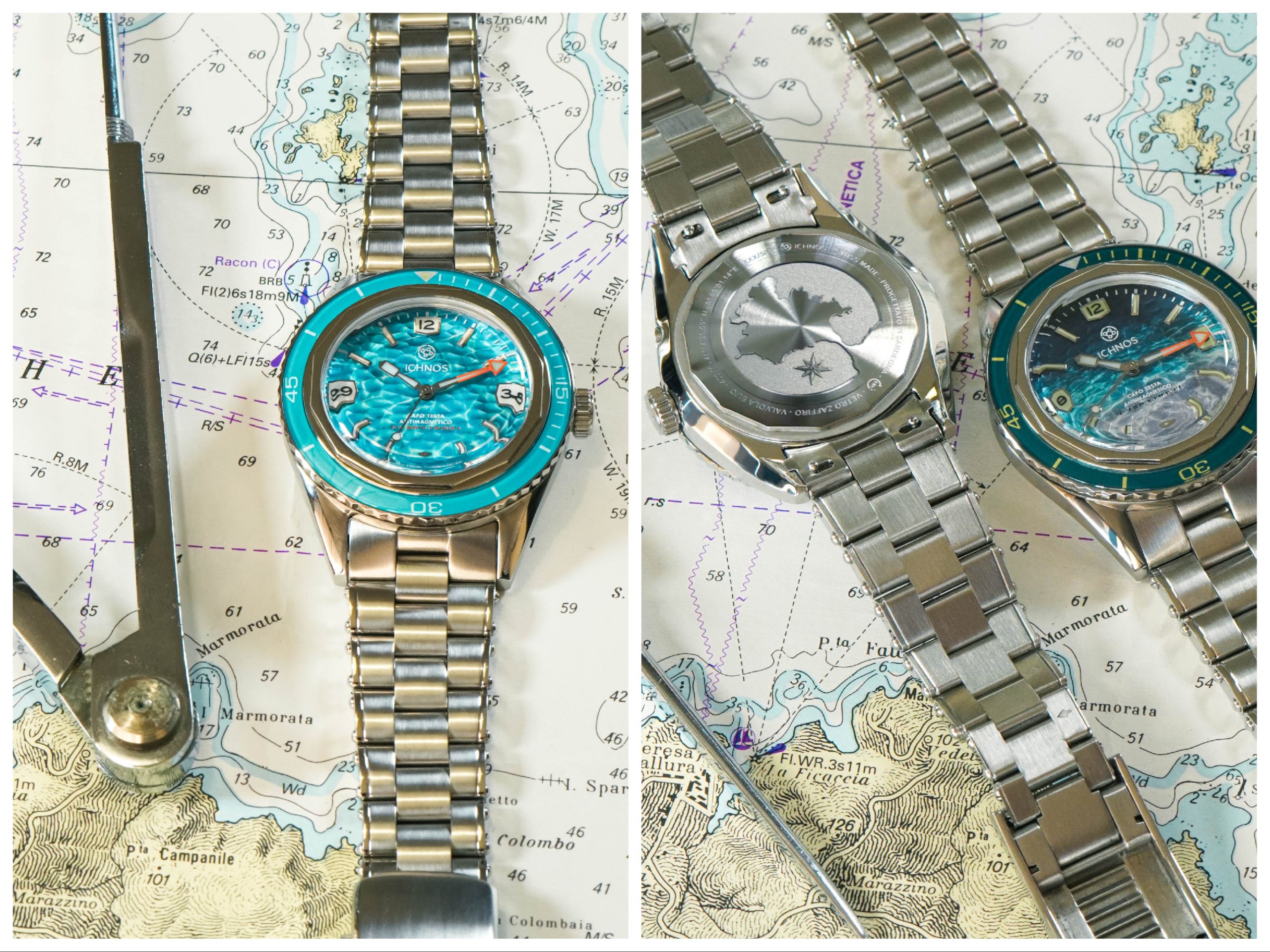 Con un “pizzico di incoscienza” – lo riconosce apertamente – Pierpaolo al canale Youtube “Underwater seatime” aperto nel 2014 e dove ha presentato decine di Diver Watches, ha poi affiancato il suo progetto orologiero. Nasceva così nel 2019 con Alessandro Mariani, imprenditore marchigiano, follower di YouTube e designer di orologi, Iknos Watches che nel 2022 ha presentato la prima collezione di segnatempo subacquei. Abbiamo messo in evidenza le date perché l’evoluzione del progetto, nato dopo aver esaminato e presentato su YouTube decine di orologi subacquei, è stata rapidissima. La collezione Arcipelago vedeva sei varianti: Chromis, Raja, Corallaro, Cala Grande, Rena di Levante e Rena di Ponente (le ultime due con quadranti lavorati con la pressa idraulica per imitare la superficie della sabbia). Sei giorni di prevendita con attesa di sei mesi per la consegna e i 500 orologi sono stati venduti al volo. Alessandro aiuta Pier Paolo nel difficile compito di “fare impresa” consentendogli di dedicarsi a un secondo segnatempo. Anche questo porta il nome di una famosa località dell’isola: Capo Testa ed è stato presentato a W.O.I lo scorso ottobre.