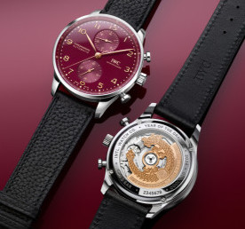 Dunque errata corrige per “l’ultima nostra segnalazione” dedicata al Capodanno cinese e al Drago, pubblicata meno di mezz’ora fa ed ecco il cronografo Portoghese di IWC con un brillante quadrante color Burgundy con lancette dorate, indici applicati e contatori in verticale. Il primo pensiero rispetto alla creatività degli orologi che sino ad ora abbiamo pubblicato, è stato: ci sembra che a Schafhausen non si siano sprecati, anche se il rosso è simbolo di fortuna, gioia e prosperità. Poi però ci siamo ricreduti, il bello viene infatti sul retro, dove il rotore dorato ha la forma del drago. Gli esemplari dedicati sono mille.