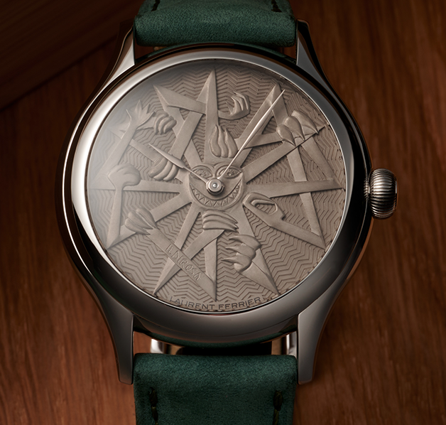 A limited edition (5 watches) of partnership between Laurent Ferrier and Hervé DiRosa, very well known french artist; dial has been worked on white gold by Jeanne Valentine Ulrich, Cadraniers de Genève, selwinding movement.