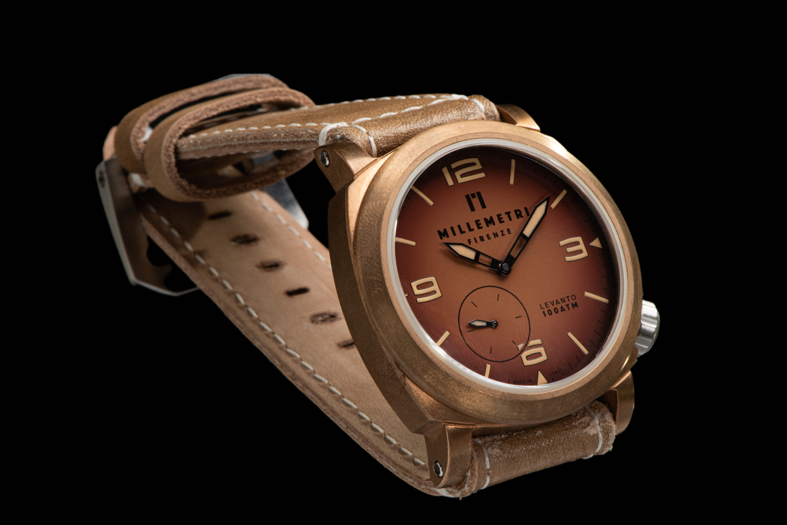Finito questo excursus nel passato, probabilmente ignoto ai giovani di oggi, arriviamo al Millemetri attuale, ereditato da Anonimo; l’azienda fiorentina ha esposto il Levanto a W.O.I. Watches of Italy a Tortona e al quinto W.O.I. emigrato a Novi Ligure, vi ha presentato il Levanto 2024, nome legato a un borgo marinaro delle Cinque Terre. Come il precedente modello esposto a Tortona, la cassa è in bronzo carrè galbè di circa 42,5 mm (tipico dei Diver Anonimo) con fondo in acciaio serrato a vite w.r. a mille metri; è stata rimossa la valvola per il gas elio per un uso non professionale dell’orologio. Il bronzo impiegato ha una percentuale bassissima di Nickel e ferro con la presenza di fosforo nella misura dello 0,4% garantisce una ottima resistenza all’usura e alla corrosione. Il colore rossastro del bronzo si lega cromaticamente a quello del quadrante. Le tre serie previste, ref.2023.01 Antracite, ref, 2023.02 Borgogna e ref, 2023.03 Marrone sono in tiratura limitata a 100 esemplari ciascuna, Le cifre arabe, ereditate dal Millemetri del 1997 sono ispirate al mondo dell’automobile sportiva degli anni ’70; indici a ore 3, 6, 9 e 12, e lancette sono stampati in materiale luminescente per assicurarne la visibilità notturna; tutti i quadranti sono sfumati verso il centro e i piccoli secondi decentrati a ore sette. Il movimento meccanico a carica automatica è il Calibro svizzero Landeron L24 che mantiene una perfetta intercambiabilità delle componenti con l’Eta 2824; i rubini sono 24 e le A/h 28.800, la riserva di carica è di 40 ore. I cinturini water resistant foderati o sfoderati sono realizzati con trattamento tecnologico brevettato che ne assicura l’uso per una intera stagione di immersioni rimanendo al contempo morbidi e piacevoli al contatto. La confezione è in pelle nappa; della stessa pelle sono anche il porta orologi da viaggio e il porta garanzia, l’intero packaging è realizzato artigianalmente a Firenze. Il set include anche le chiavi Allen esagonali che consentono al proprietario di eseguire da solo il cambio del cinturino. E anche oggi dopo circa un trentennio dietro a Millimetri c’è Federico Massacesi.