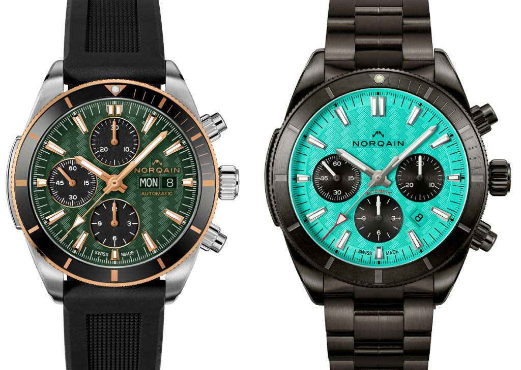 Two limited edition (100 and 300 watches; One of…is written on the back) in Norqain collection Adventure, Chrono day date and Sport Chrono, with selfwinding mechanical movement and turquoise or green dial, both are preview of WandWatch 2024.