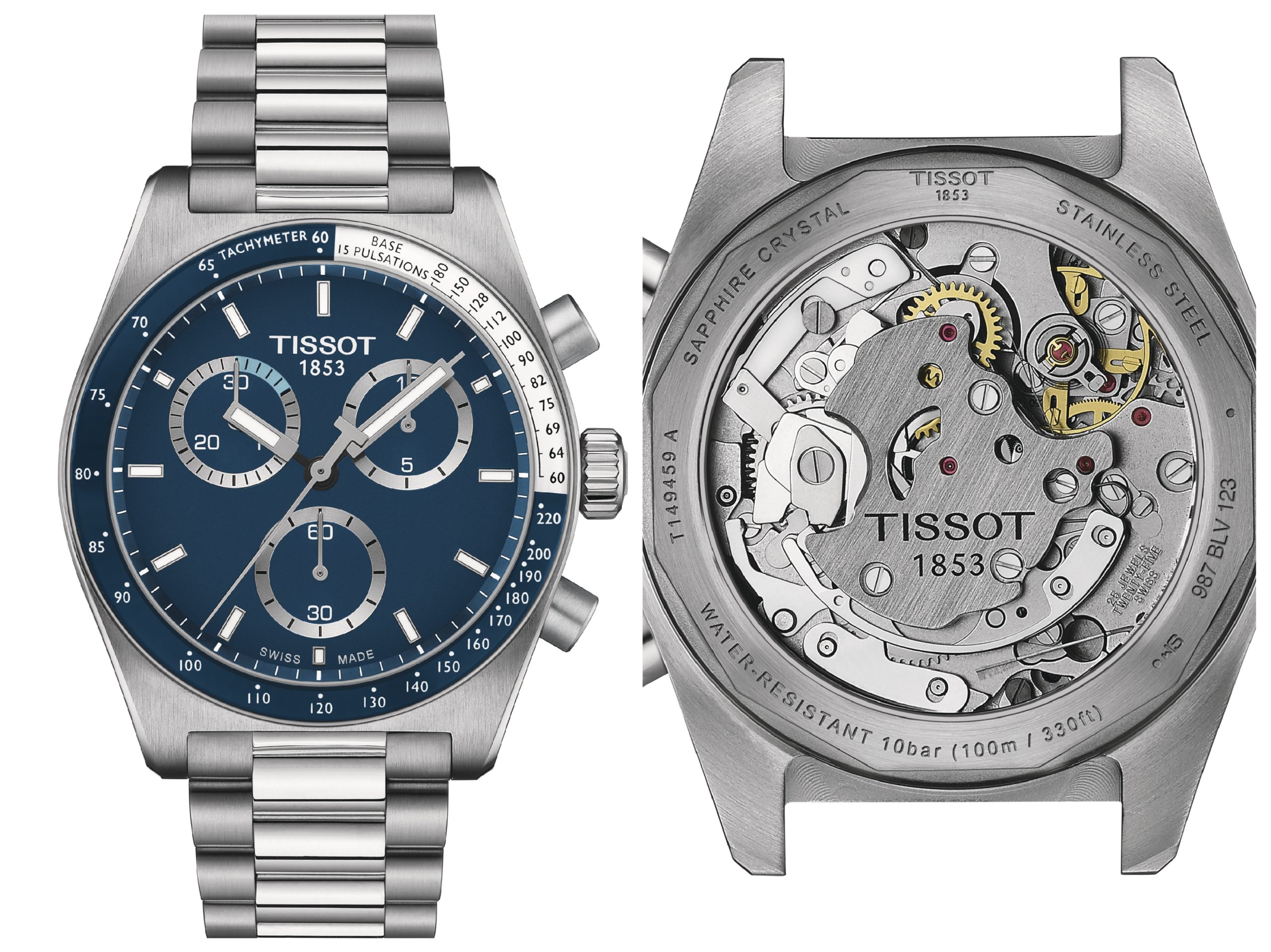 Del tutto nuovo invece il movimento meccanico a carica manuale. Negli anni ’60 il Calibro n°781 offriva quattro varianti (a carica manuale o automatica) disponibili con o senza data. Oggi l’A05.291, su base Valjoux 7753 (ø 30 mm spessore mm 7,285) è stato adattato per il nuovo orologio; rimosso il blocco della carica automatica lo si è sostituito con un nuovo ponte decorato con la dicitura TISSOT 1853; la molla di carica ha una briglia fissa e non scorrevole, così da garantire il bloccaggio completo quando è completamente carica. Il nuovo bariletto garantisce una carica di 68 ore. E non sono da dimenticare la notevole resistenza ai campi magnetici grazie all’incorporazione di NivachronTM nelle molle del bilanciere; i rubini sono 25 e le A/h 28.800. Il sistema di regolazione Chrono di ETA grazie alla regolazione a laser, ha eliminato la racchetteria tradizionale limitando l’influenza dell’usura e dell’invecchiamento sulla precisione nel corso del tempo; il grado Elaboré garantisce uno scarto di 5 ± 5 secondi al giorno. Infine infine il sistema NIVACHOC accentua la resistenza agli urti.