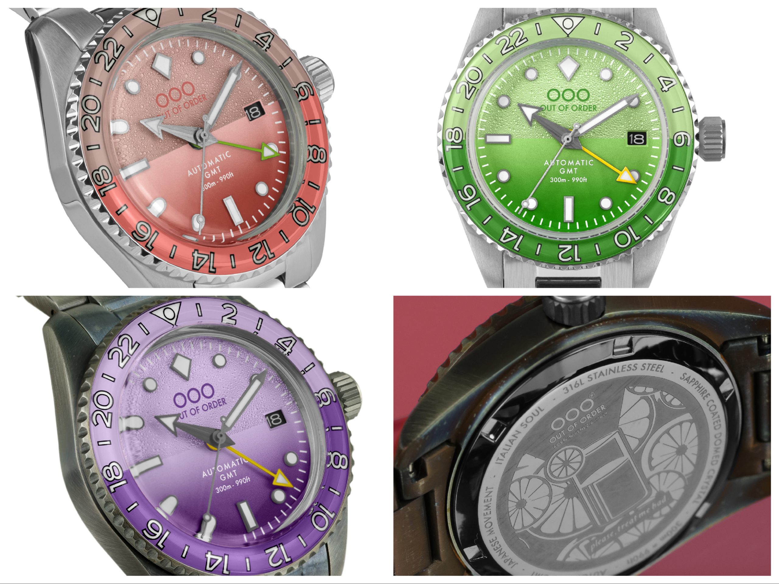 Shaker collection by OOO has three new dials remembering cocktails color, steel case w.r. m.300 and selfwinding Seiko GMT movement.