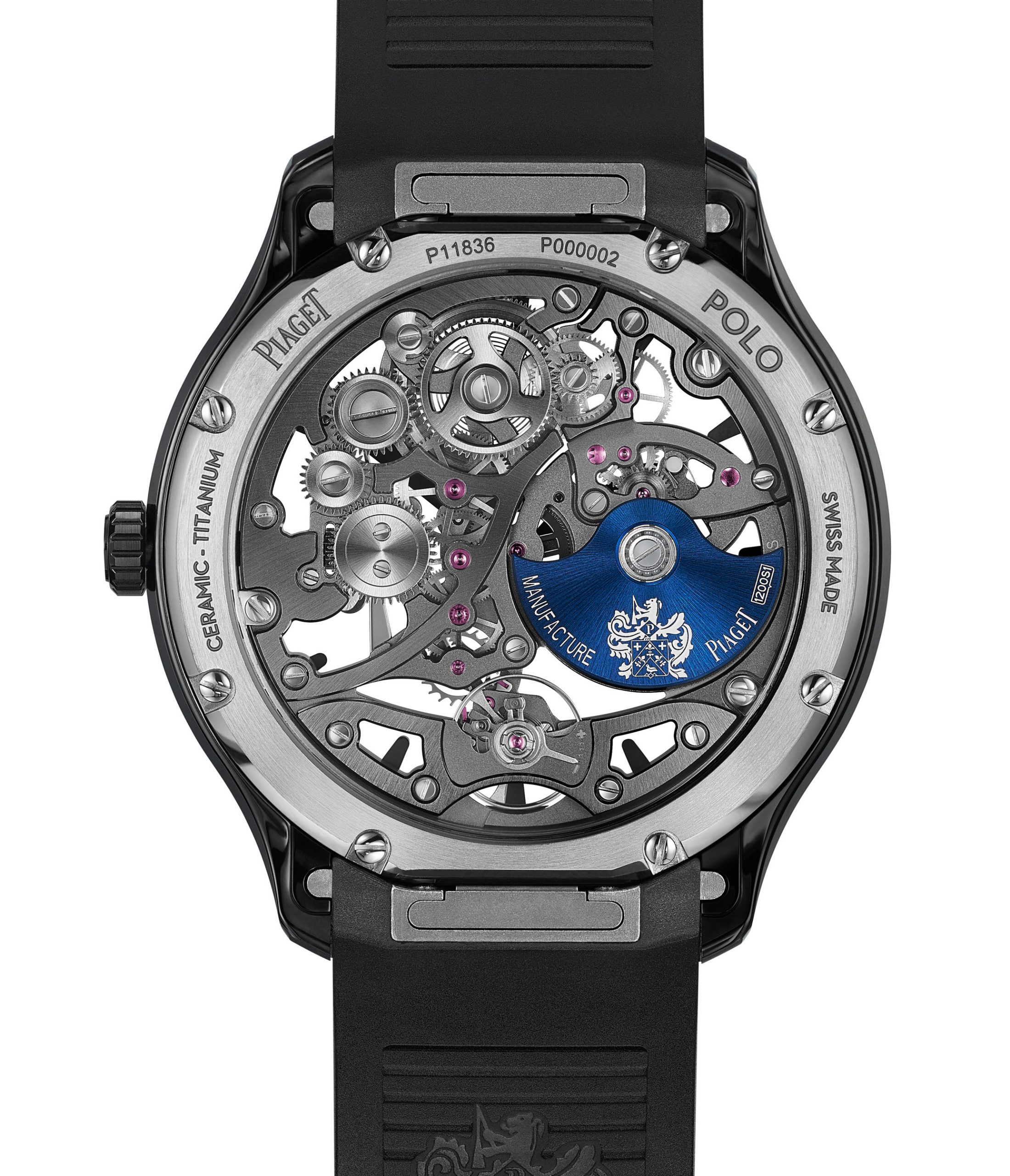 Da sottolineare che Piaget per la prima volta ha usato la ceramica per il suo iconico orologio Polo, una scelta che ha comportato tre anni di studi e test, la versione scheletrata era stata presentata nel 2021, dotata del Calibro di Manifattura 1200S1, e dopo aver acceso la creatività della Maison con strati colorati di ponti scheletrati in verde, blu e oro rosa, ha dato vita adesso al Polo Skeleton Ceramic. La cassa del nuovo Polo è stata rivisitata totalmente per accogliere i componenti ultrasottili realizzati in ceramica; è stata così ideata una nuova costruzione ancorata a un contenitore in titanio, trattato DLC nero che accoglie la cassa e i componenti in ceramica. Con uno spessore di soli 7,5 mm il nuovo orologio è spesso solo un un millimetro in più delle versioni in acciaio e in oro. Cromaticamente le sfumature impiegate attirano l’attenzione. Il movimento è a carica automatica; indici e lancette sono trattati Superluminova; per la prima volta il logo Piaget è sulla massa oscillante. Infine due i cinturini, uno in caucciù nero con fibbia déployante in acciaio e titanio, oppure uno aggiuntivo in caucciù blu.