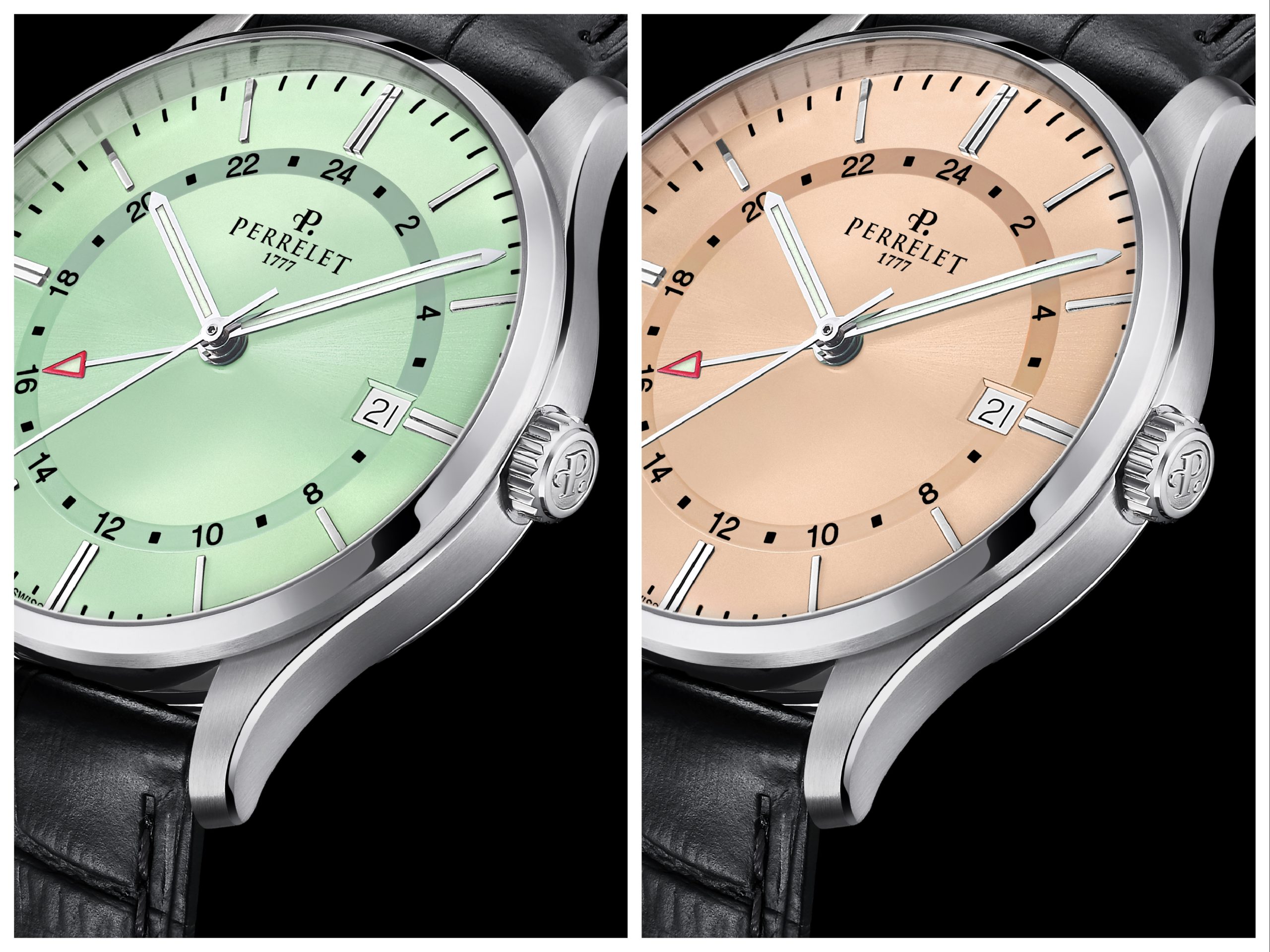 Siamo abituati per questo Marchio ad abbinarlo al modello Turbine, invece questa volta ci occupiamo della collezione Verde Menta & Salmone che comprende tre versioni, solo tempo, GMT e Open Heart per mostrare dal quadrante il bilanciere; ognuno accoglie un movimento automatico di manifattura, sviluppato in esclusiva da Soprod, società di proprietà di Miguel Rodriguez cui appartengono anche il Gruppo Festina e il marchio Perrelet. Nel Solo Tempo il calibro Perrelet P-321, Nell’Open Heart calibro P-391 e nel GMT che mostra l’ora di due fusi diversi Calibro P-401 riserva di carica 42 . La versione Open Heart è equipaggiata con il calibro P-391.