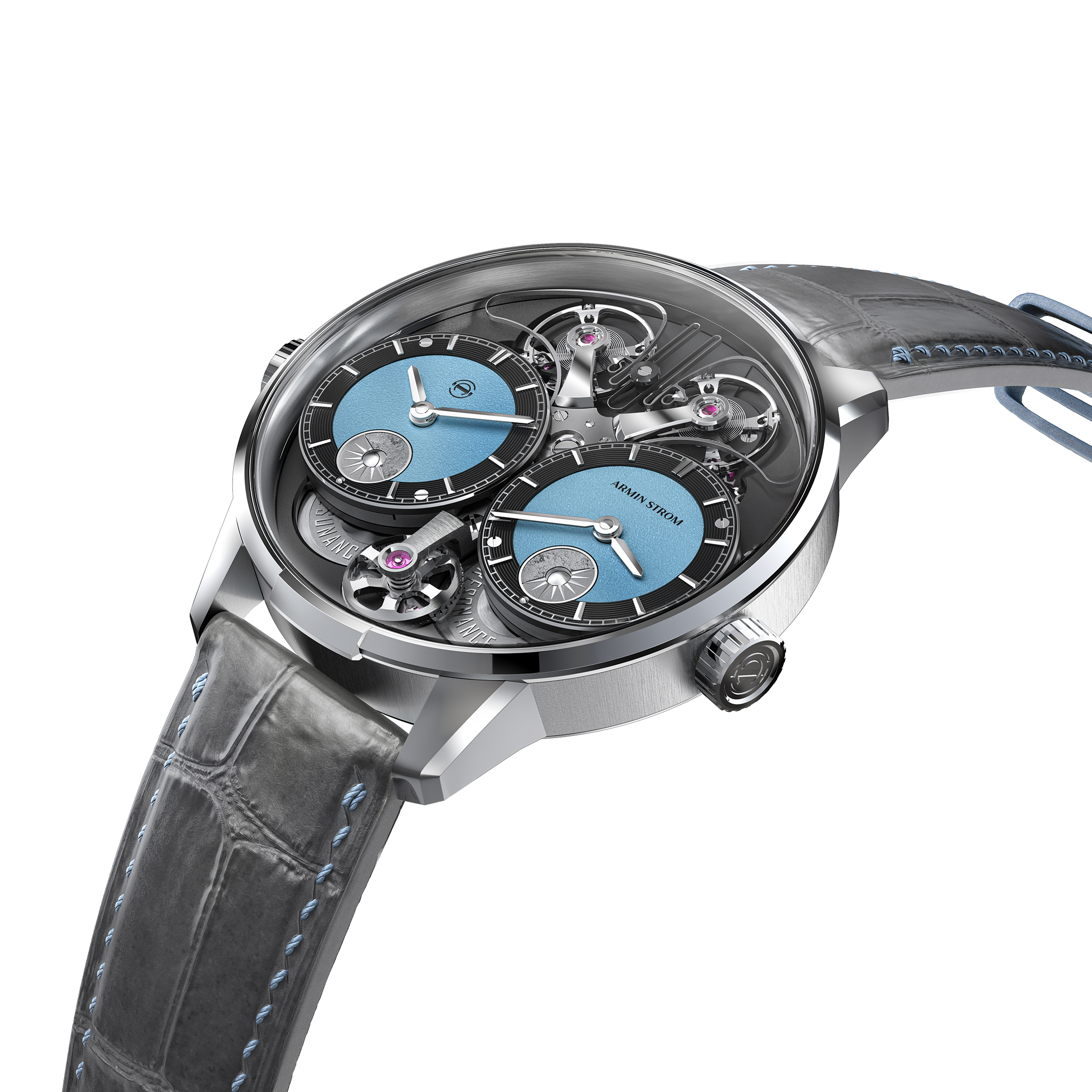 ARMiN Strom Ground-Breaking Resonance Dual Timer con al cassa in oro bianco, ø 39 mm spessore 9,05 e una scelta cromatica accattivante, il Dual Time GMT Resonance First Edition ha il fondo in vetro zaffiro, i due movimenti in verticale hanno aggiunto un plus all’estetica.