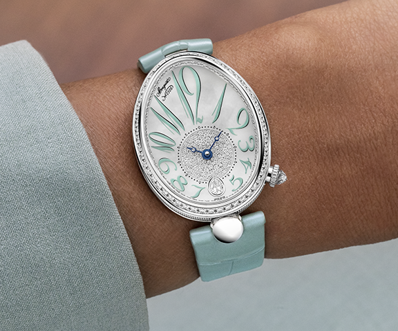 Nella collezione di questo orologio (ideato nel 1812 per la Regina di Napoli) sono presenti molte versioni: in oro rosa, oro bianco, oro giallo, più o meno preziose (con diamanti o rubini) e con movimenti a carica automatica anche arricchiti da complicazioni. I quadranti sono in oro argentato lavorato a guillochage artigianalmente e in madreperla bianca, in madreperla naturale di Tahiti, colore champagne, in smalto Grand Feu rosa pallido, bianco o nero, armonicamente scelti per affiancarsi al colore della cassa d’oro; gli indici sono in cifre Breguet e le lancette quelle tradizionali a pera volute dal grande Maestro. Infine cromaticamente la Reine de Naples 8918 presentata nella boutique Breguet in Montenapoleone, ha un colore molto primaverile, un delicato verde menta per gli indici e il cinturino. E nella palette dei colori è la tinta legata alla speranza e alla serenità.