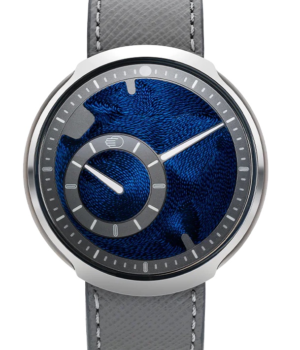 Il quadrante convesso (ø 75 mm) è in titanio grado5, ruota su biglie con satelliti eccentrici inclinati a 9,75° per indicare le ore. Il colore scelto è l’indaco (o blu cobalto o verde salvia) sfumato chiaro al centro e più scuro sul bordo, i dischi indicano le ore e i minuti con lancette trattate Grade A Super-LumiNova®. Da notare che tra la base del quadrante in titanio e il vetro zaffiro che lo protegge lo spessore usufruibile è di soli 0,25 mm.
