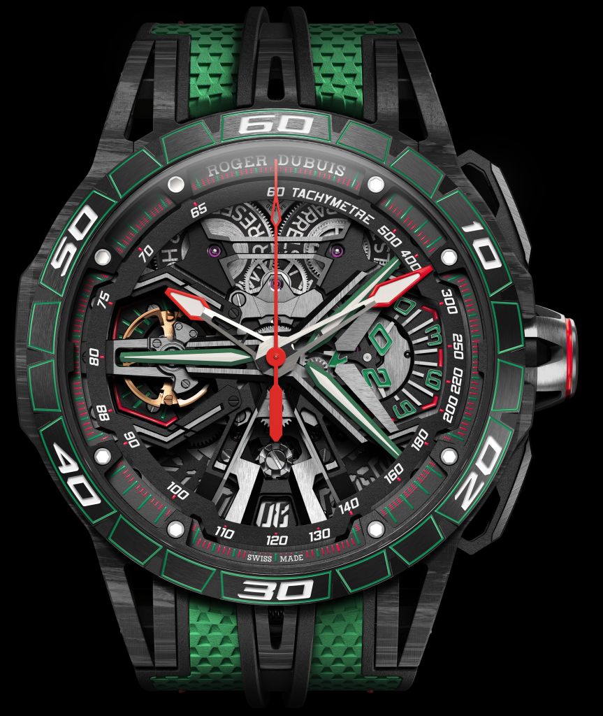 New RD Excalibur Spyder Chronograph with a Green Mantis dial e self-winding movement caliber RD780, limited edition: 88 watches (number 8 was chosen since the beginning by Roger Dubuis).