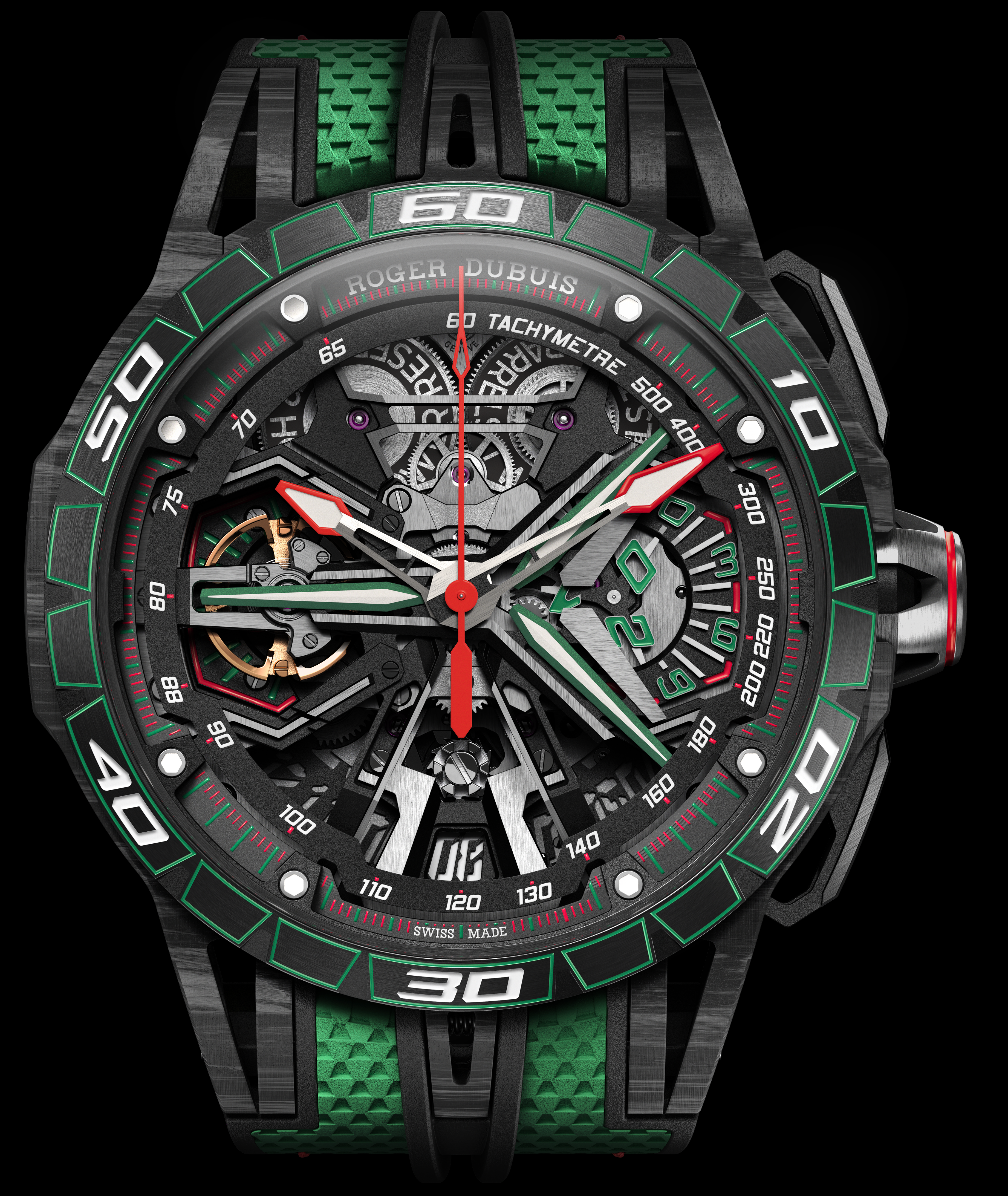 Nel 2024 la Lamborghini Corse compie dieci anni e Roger Dubuis ha aggiunto un cronografo Excalibur Spyder Fly-back in edizione limitata a 88 esemplari, con quadrante multilivello Verde Mantis, ai due già esistenti rosso e nero e verde cachi arancione, realizzati nel 2023.
