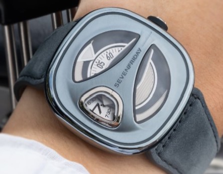La costruzione del quadrante vede 5 strati: quello intermedio con profili triangolari opachi rodiati e levigati a ore 12 e a ore 9 per indicare minuti e ore con dischi in argento rodiato sabbiato e indici in rilevo stampati in blu, quello superiore rodiato spazzolato orizzontalmente presenta una zona laccata in blu. Il cinturino in pelle color Blu Svezia ha la fibbia in acciaio.