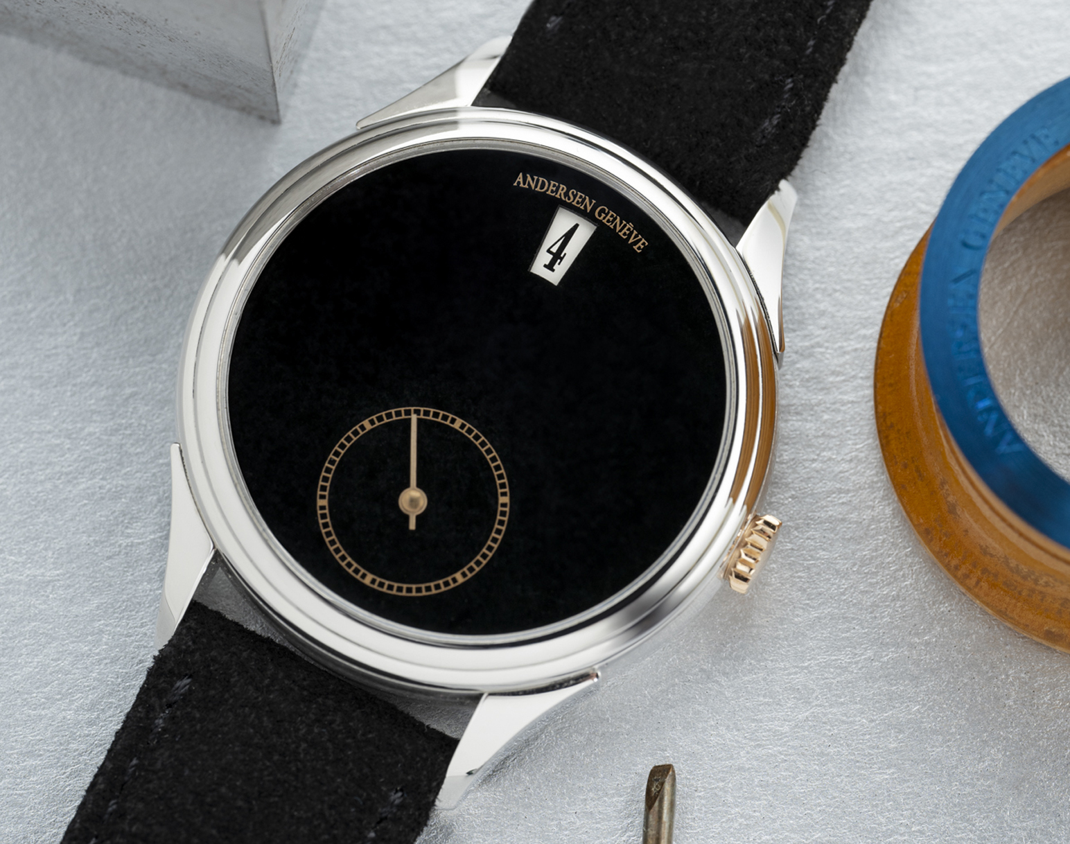Per la storia dobbiamo risalire 1995 quando al Maestro orologiaio Svend Andersen arrivò una richiesta , realizzare un orologio a ore saltanti, al quale si affiancasse la ripetizione minuti. Iniziò da allora la produzione di pezzi unici con le ore saltanti, tra i pienotti e forse più belli, il Jour et nuit realizzato nel 1998 in 125 esemplari per Cartier. Negli anni Duemila ricordiamo la partecipazione del Jumping Hours a tre G.P.H.G. nella categoria Artistic Craft dove ottenne tre nominations. Nel 2023 Andersen realizzò in 50 esemplari la versione Rising Sun Edition in platino e lancette in oro rosa. Oggi il quadrante del Jumping Hours che ha uno spessore di 0,25 mm e sotto al quale si nasconde la ruota delle ore, è completato da una sottilissima pietra di giada nera il cui spessore è di soli 0,4 mm. Sul nero della pietra risaltano, in una perfetta combinazione cromatica, dettagli rosa per l’indicazione dei minuti a ore 6 e la scritta del logo. Sul retro il vetro zaffiro mostra il movimento lavorato a Côtes de Genève e l’attenta decorazione a specchio delle viti, il tutto eseguito all’interno dell’atelier, nonché la numerazione X/50 della tiratura limitata. Un anello in oro blu a 21 carati, un colore che si ottiene unendo del ferro all’oro a 24 carati secondo una percentuale unica di Andersen e che offre un’ampia varietà di sfumature da quella più scura a quella più chiara, circonda il movimento che è il Calibro automatico Frédéric Piguet 11.50, Swiss Made, ultra sottile, con rotore in oro rosa; sul ponte in una piccola placchetta si legge la A di Andersen; la lavorazione è a grain d’orge e l’assemblaggio avviene nell’atelier del Maestro; i due bariletti garantiscono una riserva di carica di 70 ore. Infine il cinturino in tessuto nero è completato dalla fibbia in platino.