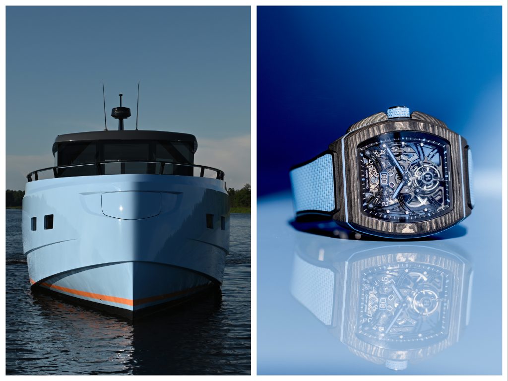 Il Glacier 48 e il Blanchet Tourbillon riflettono lo spirito che anima le due imprese. Lo yacht, nato nell’Agosto 2023, che sarà esposto dal 25 al 28 Settembre a Port Hercule durante il Monaco Yacht Show 2024, ha lo stesso colore del Tourbillon. Ma al di là delle scelte cromatiche, le due aziende hanno lo stesso approccio verso l’innovazione e la qualità dei materiali sia che si tratti di carbonio e di precisione micromeccanica nell’orologio, sia nello scafo in alluminio “epuré” dell’imbarcazione e nella sua motorizzazione, così da proporre un nuovo concetto di lusso pensato per i futuri proprietari dello yacht se appassionati di segnatempo d’alta orologeria.