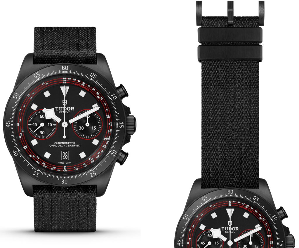 La lunetta fissa è graduata a 60 minuti, sulla corona a vite in titanio (come i pulsanti diretti) spicca in rilievo lo scudo Tudor, il vetro zaffiro è piatto. Importante guardare con attenzione il quadrante nero opaco con dettagli rossi (il colore del Marchio elvetico), lancette Snowflake e indici quadrati, presenti nei Tudor da oltre 50 anni realizzati in composito di ceramica luminescente: sul réhaut a 45°, la scala tachimetrica presenta un anello interno adattato alle velocità di corsa dei ciclisti. A ore 3 il contatore dei 45 minuti e alle 9 i piccoli secondi, alle 6 la data con correzione rapida. Anche il cinturino ad anello in tessuto è speciale; realizzato sugli ottocenteschi telai dell’azienda francese Julien Faure a St.Etienne, è comodo, robusto e tecnico con una fascia larga 22 mm in tessuto jacquard nero con la tradizionale fibbia ad ardiglione. In quanto al Movimento cronografico con ruota a colonne e innesto verticale, certificato cronometro dal COSC è l’ottimo risultato delle sinergie tra Tudor e Breitling il cui Calibro Breitling 01 sviluppato da Tudor presenta un’accurata finitura.