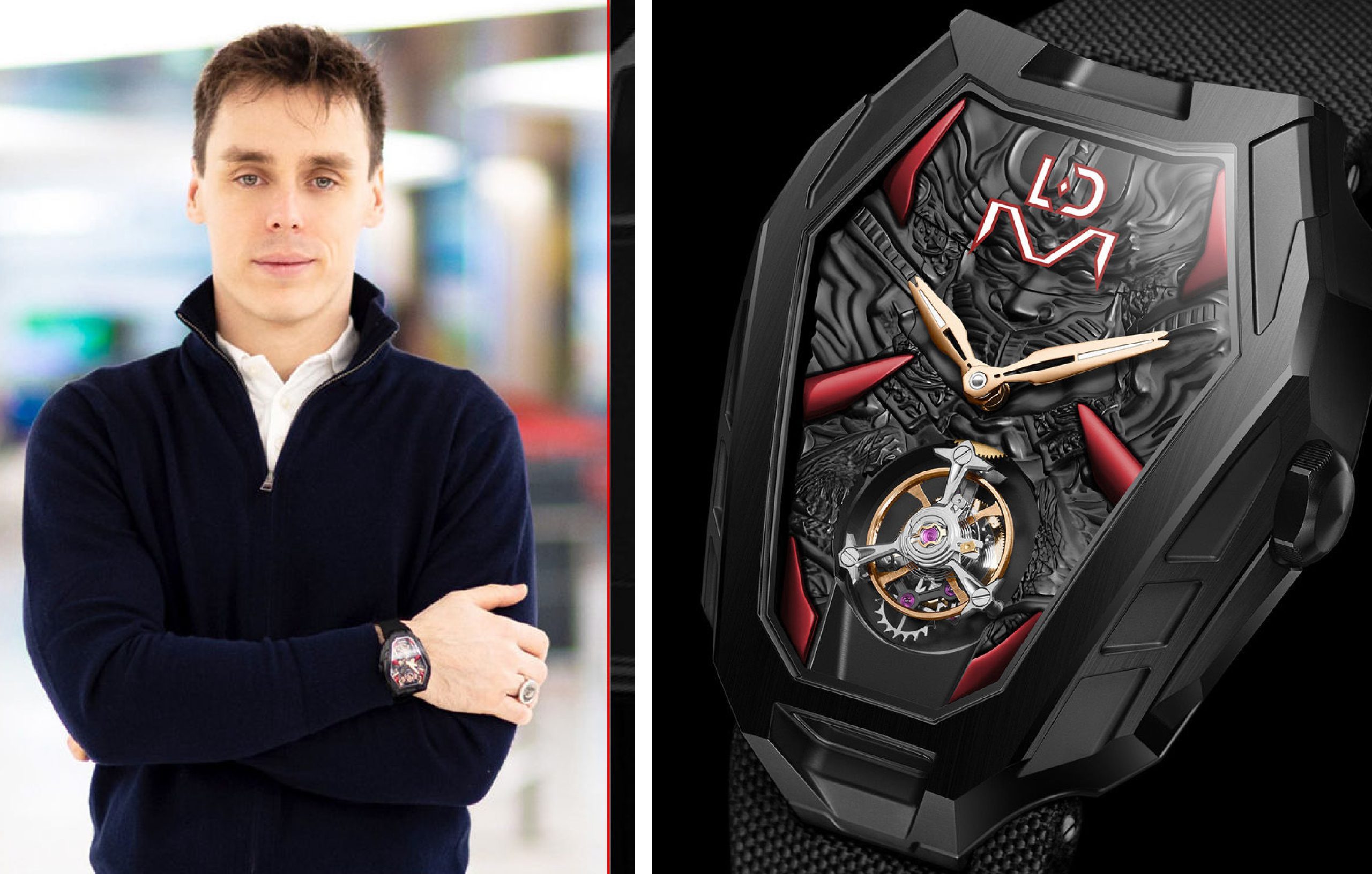 From Emera new watch born from Samurai leggendo with selfwinding movement tourbillon escapement and Titanium grade 5 case, worn by young Luis Ducruet during a gala dinner in Monaco on January 2024.