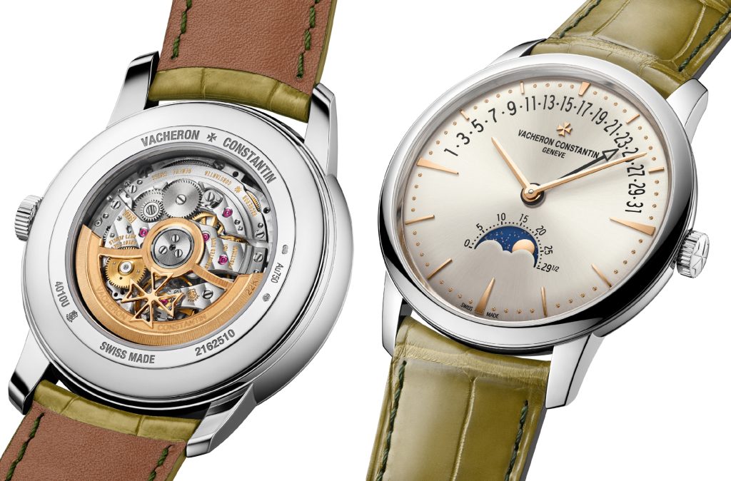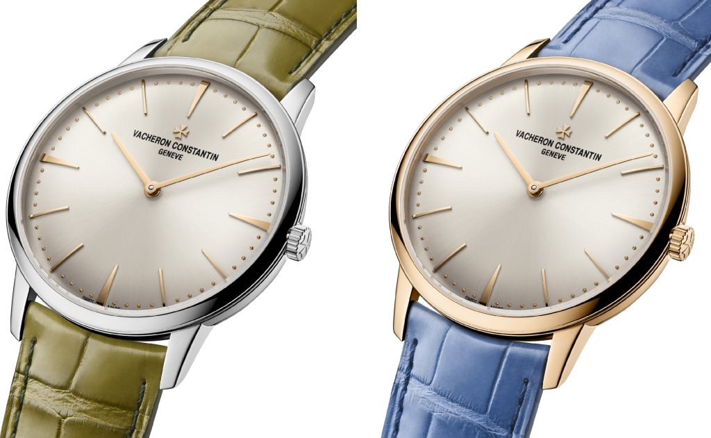 Le altre due novità di quest’anno sono rappresentate dai Patrimony ref.1410U/000G-H017 e ref.1410U/000R-H018 con cassa ø 39 min oro bianco o rosa, fondo chiuso (dove si possono far eseguire incisioni), abbinata a quadranti argento antico con la parte esterna convessa, minuteria circolare applicata con perle in oro rosa, Indici geometrici applicati e lancette in oro rosa. Il movimento a carica manuale è il Calibro 1440 sviluppato e prodotto in house, spessore mm 2,6, A/h 28.800, 19 rubini. Sono completate da cinturini in alligatore Mississippiensis verde oliva o azzurro a squame quadrate, con fodera di vitello e impunture tono su tono; la fibbia nell’oro della cassa a forma di mezza croce di Malta è ad ardiglione.