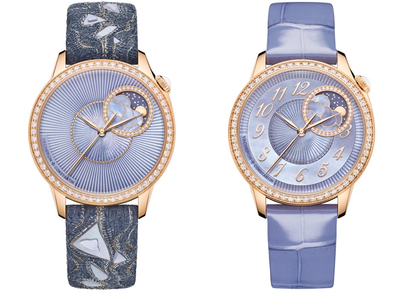 Entrambi con l’indicazione delle fasi di luna, i due orologi, si differenziano per il quadrante e non solo. Nel progetto “Égérie The Pleats of time”, la cassa rotonda in oro rosa ø 37 mm con diamanti e corona a ore 2 incornicia un quadrante in madreperla plissettato oppure liscio e decorato con una fascia mat; per entrambi il colore è lilla cipria, non ci sono indici e a ore 8 si legge il Marchio ginevrino che, in diagonale, fa pendant con le fasi di luna circondate da diamanti. Un’altra particolarità è data dal cinturino disegnato da Yiqing Yin, in cui fili in seta si intrecciano con frammenti di madreperla e che racchiude la capsula di una fragranza originale di Dominique Ropion cosicché ad ogni movimento del polso ne rilascia la delicata profumazione. Realizzati in tonalità pastello (lilla, malva, violetta di Parma che si sovrappongono) anche tre cinturini intercambiabili.