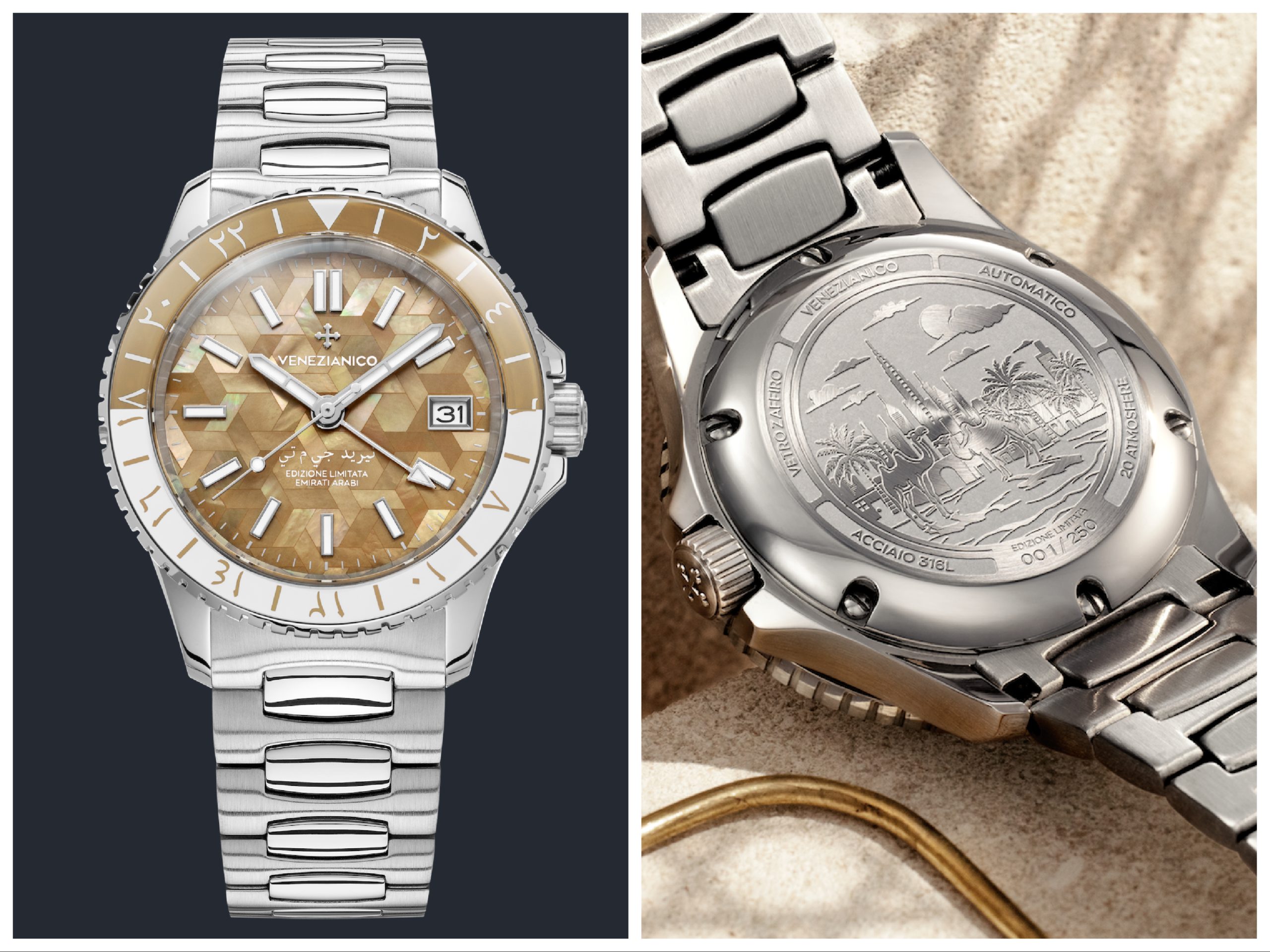 New Venetianico GMT for Arabic Emirates in limited edition, with sand color dial and an actual skyline on the back