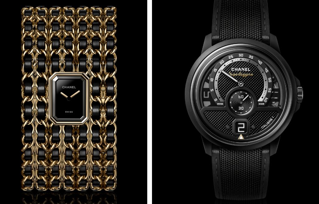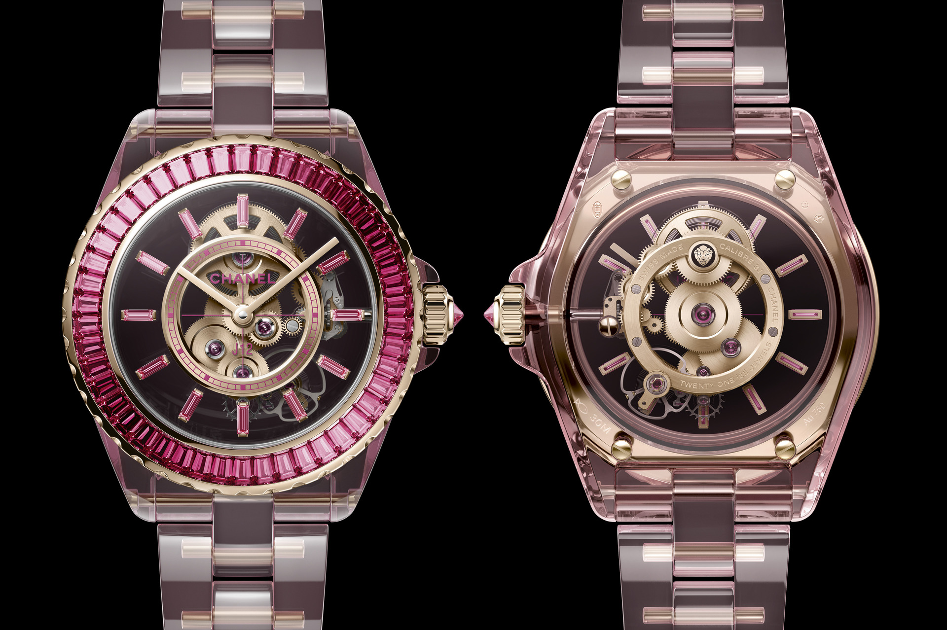 A seguire la collezione Monsieur de Chanel, unico orologio maschile ø42 mm con movimento meccanico Calibro 1 , in versione Superleggera black che, presentata nel 2013, adesso comprende cento esemplari in ceramica nera, carica manuale con ore saltanti e minuti a retrograde. Sempre nell’la collezione iconica J12 sono arrivate nuove scelte cromstiche. Nel J12 Edition Rose (55 esemplari con cassa rotonda 38 mm e movimento automatico Calibro 12.2. certificato COSC) l’oro beige di Chanel è stato impiegato per cassa, lunetta e bracciale in acciaio placcato: vi si aggiungono poi i 12 preziosi esemplari con oltre 90 zaffiri rosa. Chi preferisce la cassa rettangolare può scegliere il Boyfriend squelette, 55 esemplari (altri 55 sono quelli versione Xray) con movimento meccanico manuale squelette con zaffiri rosa taglio baguette.