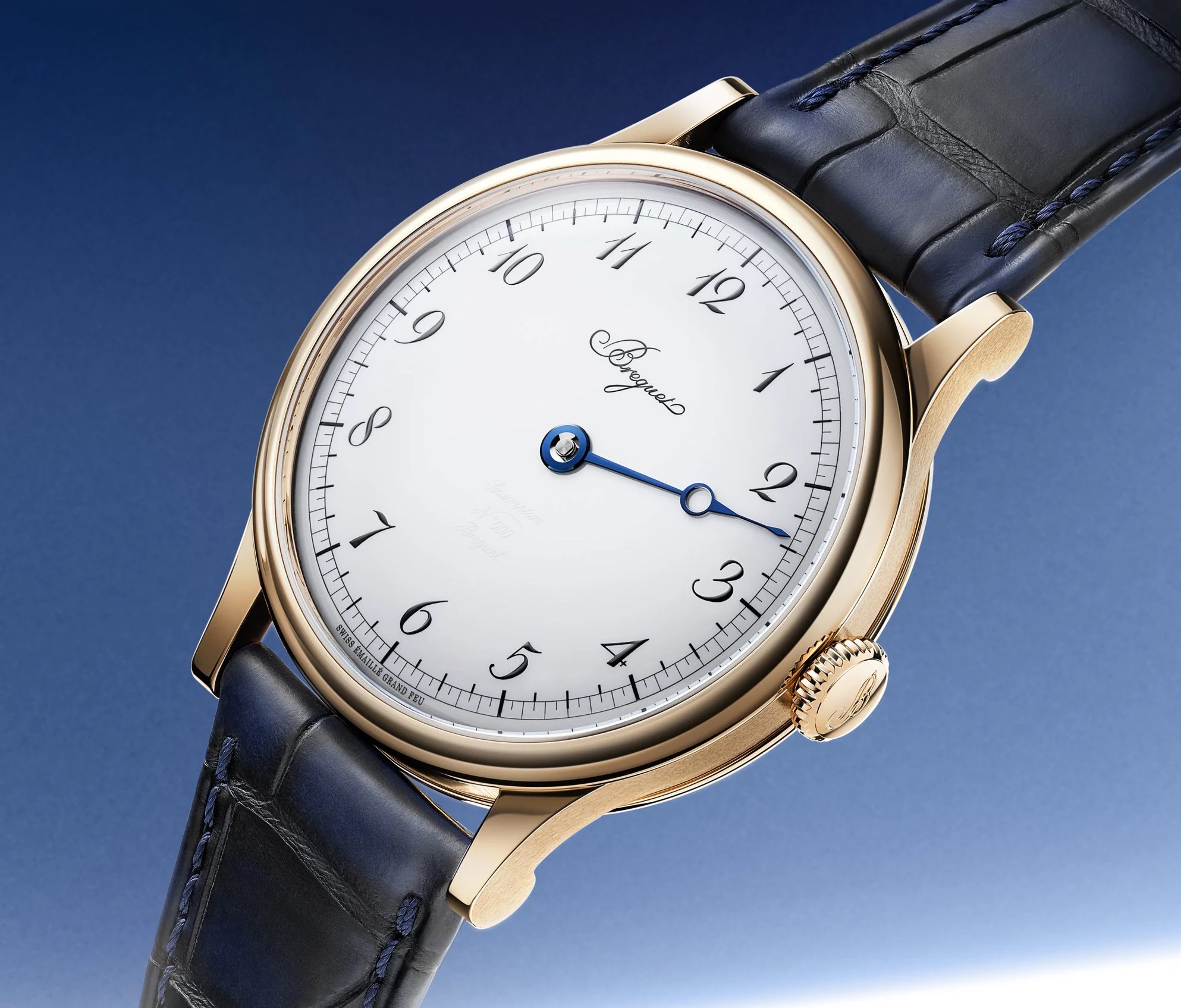 Sul quadrante in smalto bianco Grand Feu, al centro spicca la lancetta che riprende la tradizionale forma del passato aperta e a punta in acciaio azzurrato e curvata a mano; la punta affusolata arriva sui numeri arabi leggermente inclinati e sulla minuteria a “chemin de fer” circolare che indica le ore e i minuti evidenziati al 5, 10, 15, 30; sia gli indici sia gli indicatori sono smaltati in Petit Feu nero, nella stessa tonalità del Marchio a ore 12. Il cinturino di questo splendido orologio è in alligatore nero.