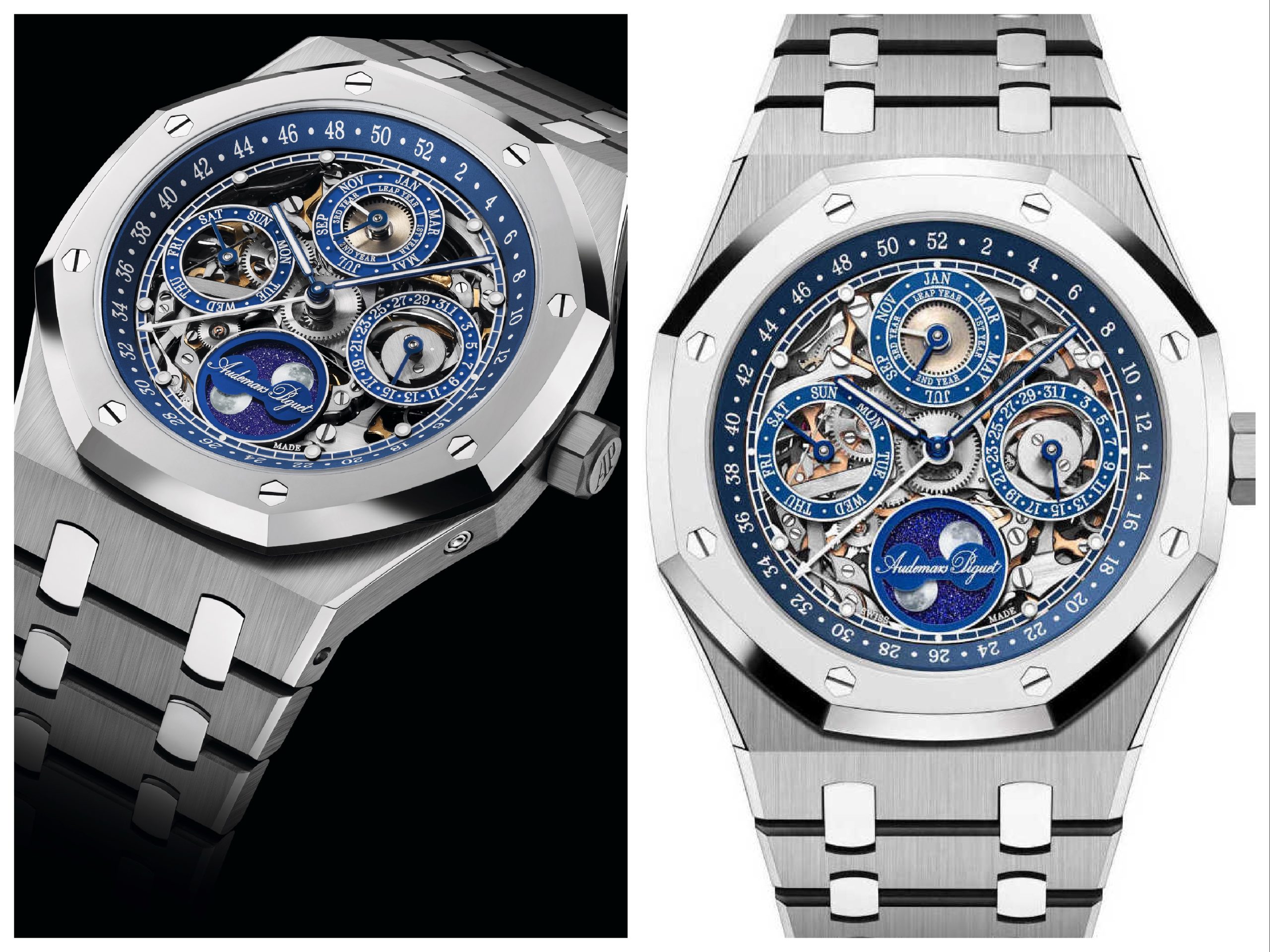 I 150 esemplari recano sul fondello la scritta “1 of 150 pieces”. La cassa, ø 41 mm, spessore mm 9,9 in titanio w.r. a m.20 ha la corona in titanio ed è affiancata dal vetro Bull Metallic Glass (BMG) per la lunetta e la cornice del fondello; oltre ad essere molto resistente all’usura BMG accentua la luminosità delle superfici (la percentuale di palladio impiegata in questa lega da Audemars Piguet è del 50%). Il vetro a protezione del quadrante e del fondo è in cristallo di zaffiro. Sul quadrante in vetro zaffiro lancette baignoire blu in oro bianco; la scelta del colore, un intenso blu-grigio, per il réhaut e le cornici dei sotto quadranti è perfetta per far risaltare le indicazioni bianche. Le maglie del bracciale sono in titanio con anse in BMG, la fibbia di chiusura a tre lame è in titanio.