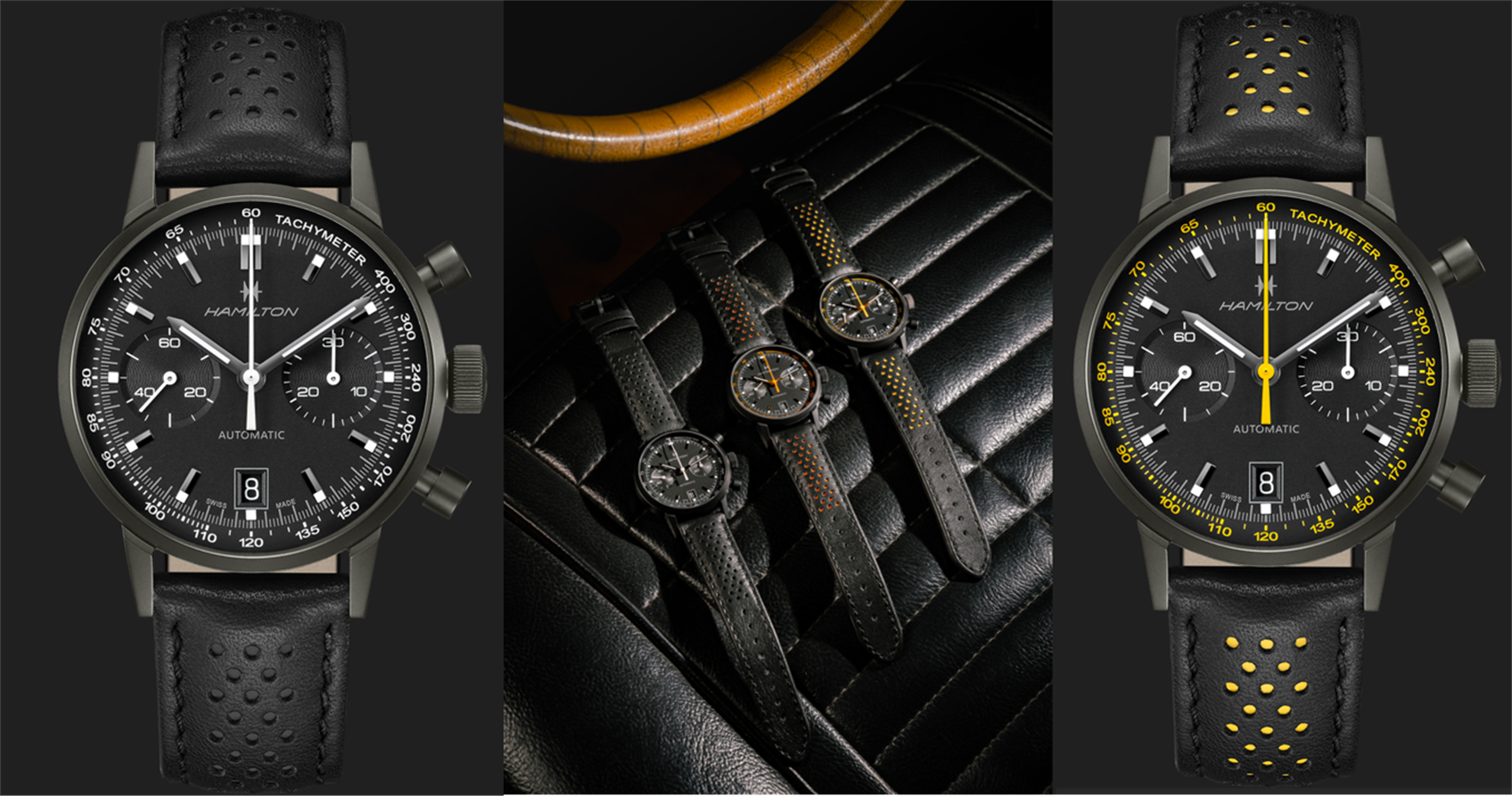 La cassa dei nuovi cronografi, ø 40 mm è nero opaco (PVD); si può scegliere la versione minimalista con indici e lancette bianche oppure optare per quella con dettagli giallo elettrico o ancora per quella arancione molto attuali. Water resistent a m.100 questo cronografo ha la corona è a vite e alle 10 si nota il correttore rapido della data. Sul quadrante, protetto da cristallo di zaffiro, i due contatori, ricordo del passato, la data, la lancetta del cronografo e il tachimetro. Grazie alla in sinergia fra la lancetta del cronografo e il tachimetro si misura la velocità media tra due punti in base al tempo trascorso. Una volta vista la misurazione, basta premere il pulsante inferiore e la lancetta del cronografo torna a ore 12, pronta per una nuova misurazione. il movimento automatico ha 28 rubini, spirale in NivachronTM e riserva di carica di 60 ore. Cinturino nero traforato in vitello o con inserti dello stesso colore delle lancette e della scala tachimetrica, fibbia ad ardiglione e finitura PVD nera.