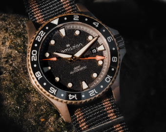 Nella collezione dei Khaki Navy è arrivato, distribuito sul nostro mercato da Swatch Group of Italy un nuovo modello con funzione GMT. Cassa ø 43 mm w.r.a m.300, in acciaio o in bronzo, quadrante bianco o nero lavorato a grani, movimento automatico Calibro H-14 con spirale Nivachron™, riserva di carica 8o h e cinturino Nato in tessuto per il quale sono stati scelti colori che si armonizzano con la cassa in bronzo, o bracciale in acciaio.