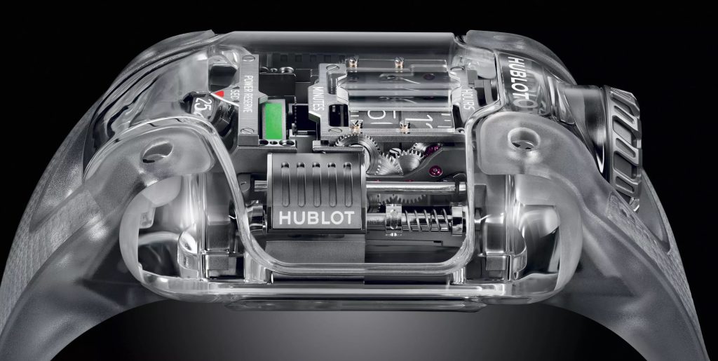 Hublot ha realizzato il suo MP10 Tourbillon presentandolo nella prima settimana di Maggio in due nuove versioni della cassa in vetro zaffiro e ceramica nera, ma non è solo questo il risultato ottenuto dopo tre anni di studi ed esperimenti per ottenere i primi cinquanta esemplari; il doppio vetro zaffiro permette di ammirare le due masse lineari. Il colore nero è stato scelto anche come riferimento alla serie All Black per la quale Hublot è stata antesignana. Entrambe le versioni sono prive di quadrante, lancette e della massa oscillante: la visualizzazione è a rulli, la riserva di carica circolare e il tourbillon inclinato a 35° ha la carica automatica tramite due masse lineari. A questi 50 esemplari si aggiungono i 30 dove il colore scelto è un bianco immacolato, qui è trasparente anche il cinturino. Al posto delle lancette quattro display a rotazione continua: le ore e i minuti nel terzo superiore del quadrante, abbinate a un vetro effetto ‘lente di ingrandimento’; la riserva di carica circolare nel terzo centrale, dotata di tre zone di colore verde, arancione e rosso per le 48 ore del conto alla rovescia e infine i secondi nel terzo inferiore indicati direttamente sulla gabbia del Tourbillon.