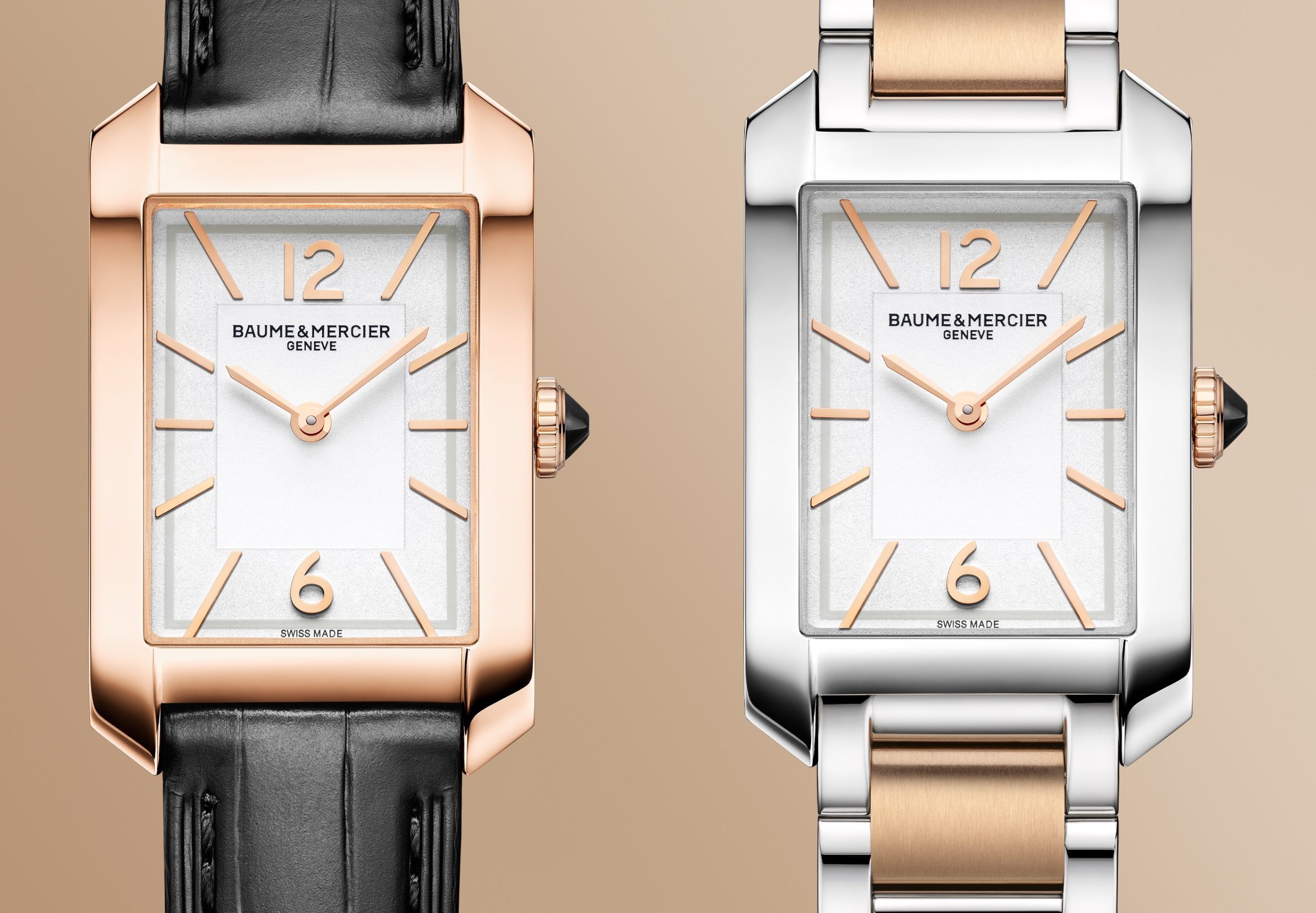 L’eleganza è quella che sin dagli inizi ha distinto tutti i Baume & Mercier. La cassa di forma della Ref.10752, in oro rosa 750/1000 e titanio con finitura lucida, è perfetta per i polsi femminili, misura mm 35×22,2 e ha uno spessore di 6,9 mm; è w.r. a m.50 e viene completata da un cinturino in alligatore nero a scaglia quadrata e impunture tono su tono e fibbia ad ardiglione o da un bracciale a tre maglie, con quella centrale dorata facilmente intercambiabile e con fibbia pieghevole. Il fondo è pieno e si presta ad essere inciso. Sul quadrante opalino e grainé lancette sfaccettate a gladio, dorate. La corona in acciaio PVD dorato è impreziosita da un cabochon di agata nera. La Ref.10751 è in acciaio e acciaio rivestito oro rosa. Per entrambe le versioni il movimento Swiss Made è al quarzo e garantisce un’autonomia di 8 anni.