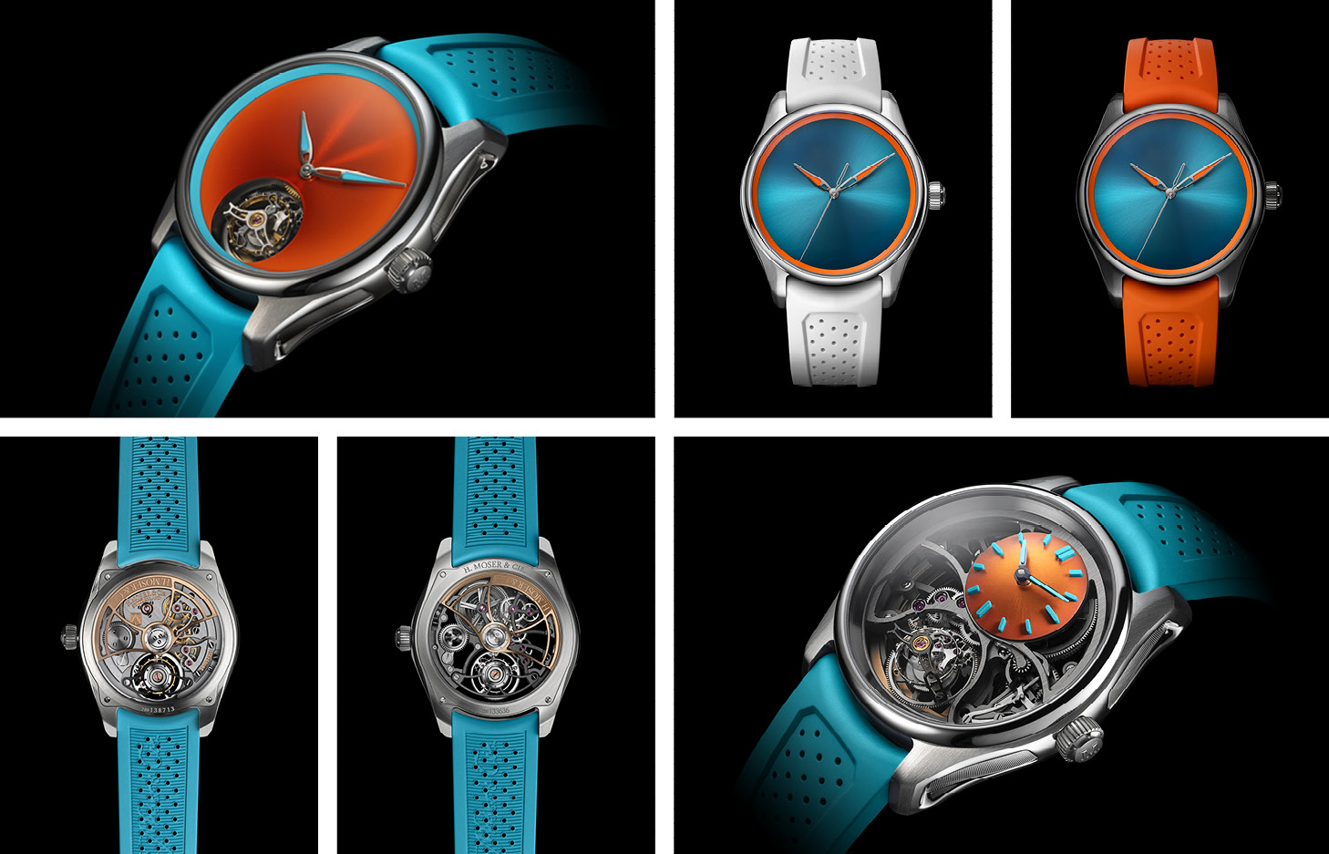 Non solo in acqua, ma anche sulla terra tre novità di H:Moser & Ce. tutte w.r. a m.120 con cassa in acciaio; nel Pionner Secondi al centro il movimento è il Calibro HMC201, nel Pionner Cilindrical Tourbillon Skeleton il Calibro HMC811 e nel Pionner Tourbillon il Calibro HMC805 con doppia spirale (Pioneer Central Seconds Spiced Aqua Ref.3201-1202 o Ref.3201-1205 per quello trattato DLC nero con cinturino arancione). Per chi ama conoscere ulteriori dettagli eccoli: Pionner Cylindrical Tourbillon Skeleton cassa in acciaio ø 42,8 mm, fondo a vista, corona con logo, quadrante scheletrato sfumato arancio, indici e lancette trattati Globolight® turchese, cinturino in caucciù turchese, movimento automatico (A/h 21.600, rubini 28, massa oscillante bidirezionale, flying tourbillon). Pionner Tourbillon Spiced Aqua cassa ø 40 mm, quadrante arancio sfumato indici e lancette trattati Super-LumiNova®turchese. Pionner Central Seconds cassa mm 42,8 (quadrante sfumato turchese, lancette a foglia trattate Super-LumiNova®, movimento Cal.HMC201 (A/h 21.600, rubini 27, massa oscillante bidirezionale con logo, carica 3 giorni).