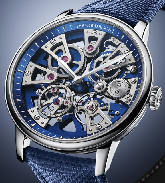 Grande la cura per la finitura dei componenti sia sul quadrante (il cui réhaut è trattato PVD blu), sia nel movimento; i ponti scheletrita hanno contorni smussati, il meccanismo della corona, capovolto e collocato sul fondello crea una corrispondenza speculare alla prima ruota a ore 9. E ancora la molla cricco che controlla lo svuotamento del primo bariletto, infine gli indici applicati rodiati riprendono la sfaccettatura delle lancette. Altrettanto curata nei dettagli la scelta cromatica: Tutti gli strati bassi del calibro A&S5201 meccanico a carica manuale sono trattati PVD blu (le A/h sono 21.600, i rubini 24, due bariletti cui coperchi sono trattati PVD blu); dal lato quadrante della platina sino alla rabescatura “Rayons de la Gloire” (cifra stilistica di Arnold & Son) è una sinfonia cromatica immediata; ponti, rocchetti, gli elementi dell’ingranaggio e il bilanciere rodiato sono placcati in palladio per richiamare il colore della cassa in acciaio, i ponti con trattamento palladio, sono lucidati e smussati, le superfici satinate, le ruote cerchiate e smussate, i castoni sono in oro 18 carati e le viti hanno le teste smussate e lucidate specchio. Per finire, il cinturino in alligatore o in caucciù è anch’esso, blu (anche se è disponibile un bracciale in acciaio a tre maglie).