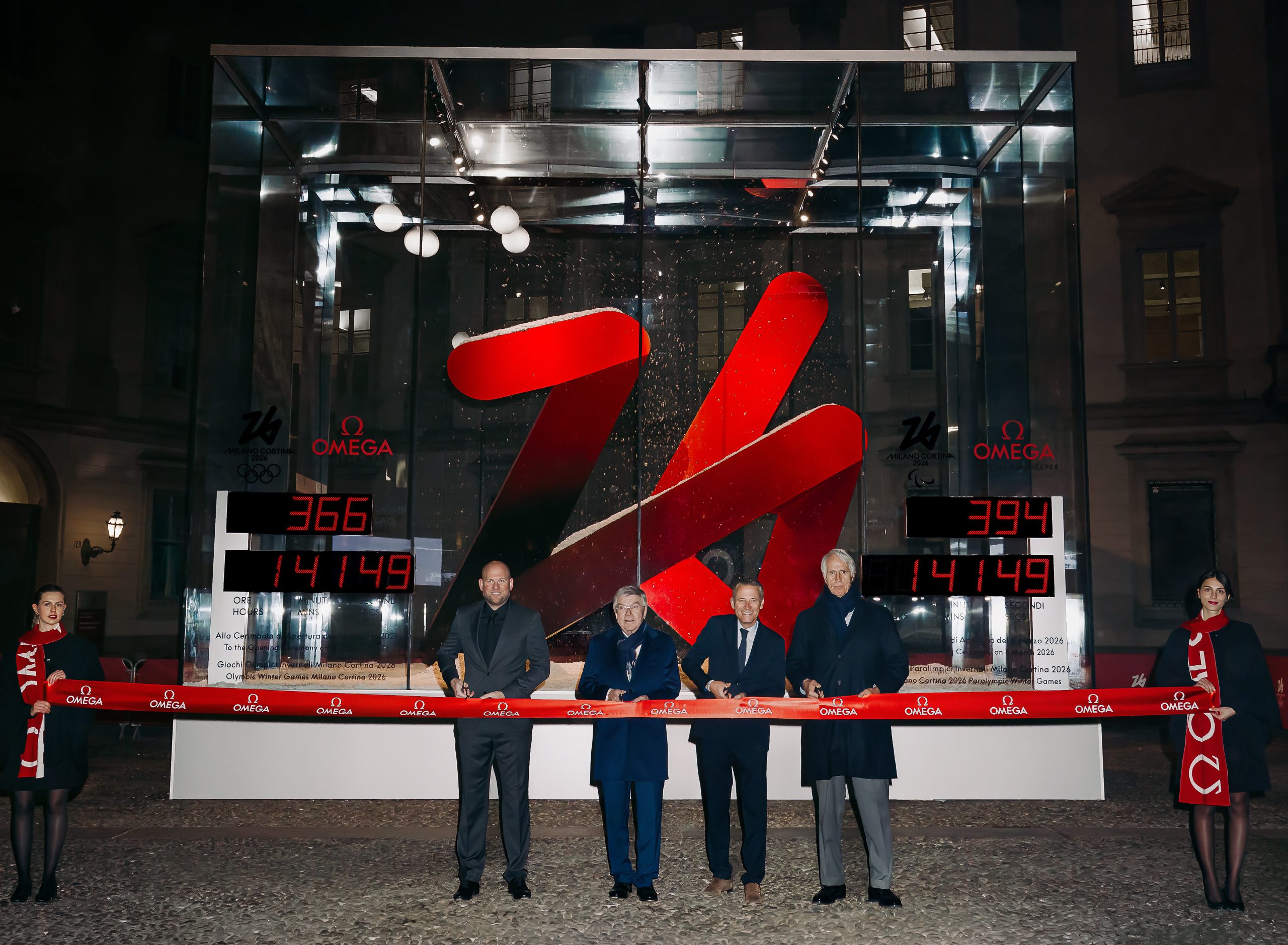 Ben custodito il count-down è stato realizzato in una palla di vetro con la neve che sembra turbinare grazie a un sistema speciale di flusso d’aria che crea l’effetto continuo di una nevicata; sui due display digitali il susseguirsi dei giorni, delle ore, dei minuti e dei secondi che mancano alla Cerimonia di Apertura dei Giochi Olimpici Invernali il 6 febbraio 2026 e dei Giochi Paralimpici Invernali che inizieranno il 6 marzo. Nella foto il taglio del nastro con Raynald Aeschlimann, Presidente e CEO di Omega, affiancato da Thomas Bach Presidente del Comitato Olimpico Internazionale, Alain Zobrist CEO di Omega Timing e Giovanni Malagò, Presidente della Fondazione Milano Cortina 2026.