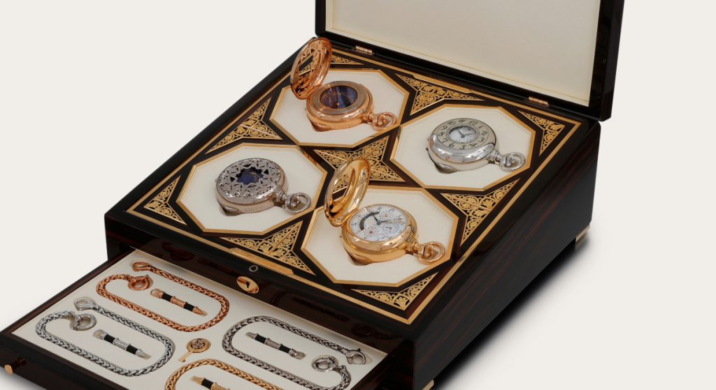 Forse si stabilirà un record, anche se un simile set con i quattro prestigiosi orologi da tasca intonsi, realizzati in oro bianco, oro rosa, oro giallo, platino e per di più accompagnati dalla catena per appenderli e dallo strumento per regolarli è qualcosa di eccezionale, sia per le 21 complicazioni che si vedono sul duplice quadrante, sia per i sei brevetti ottenuti dalla Casa svizzera. Ricordiamo che lo Star Caliber 2000 fu realizzato da Patek Philippe per l’avvento del nuovo millennio, di qui il suo nome.