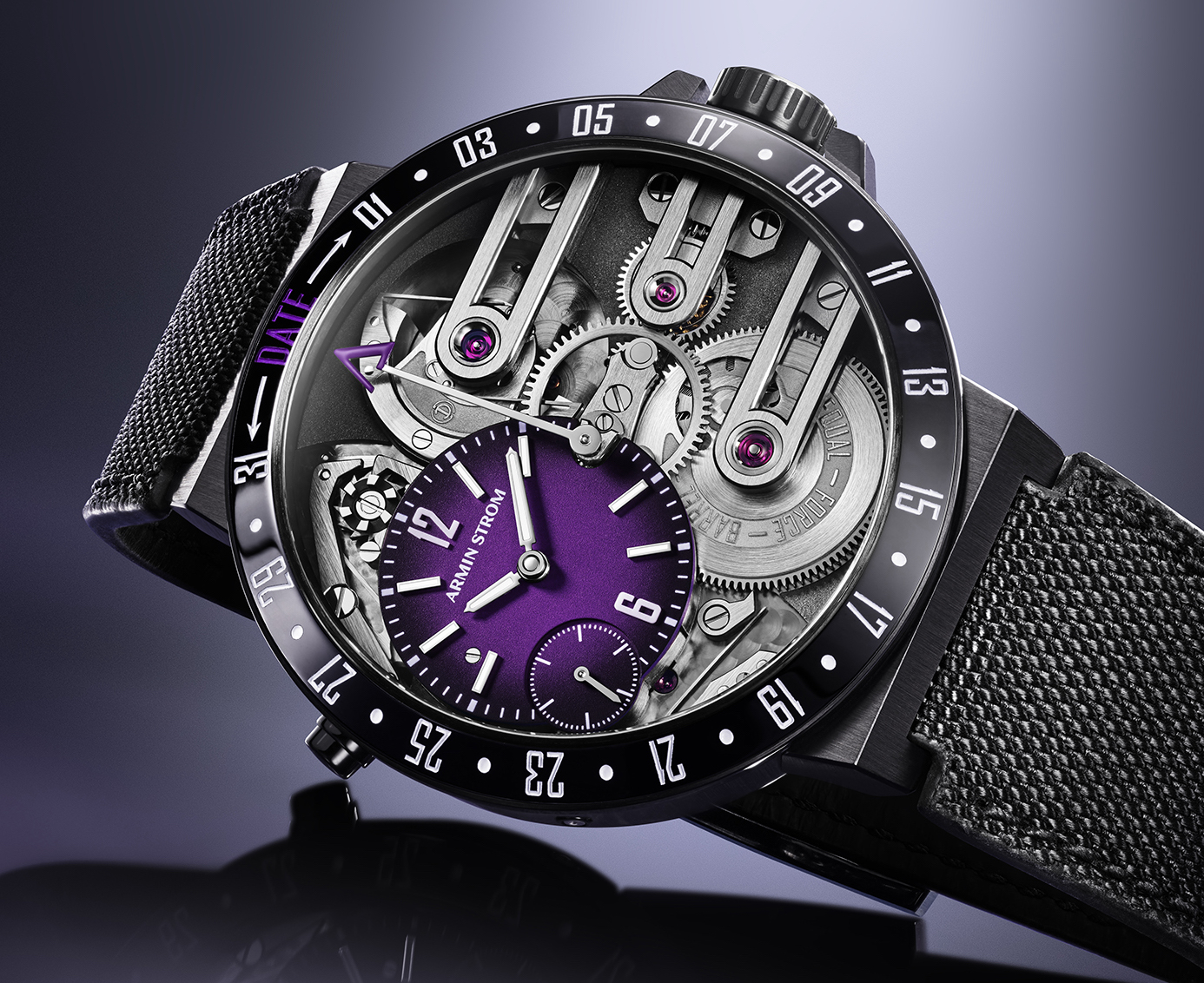 Yesterday Armin Strom AG unveiled new Orbit Purple Midnight, steel case, manufactured authomatic movement, excentered purple fumée dial and two patented fonctions: requested date and colum wheel.