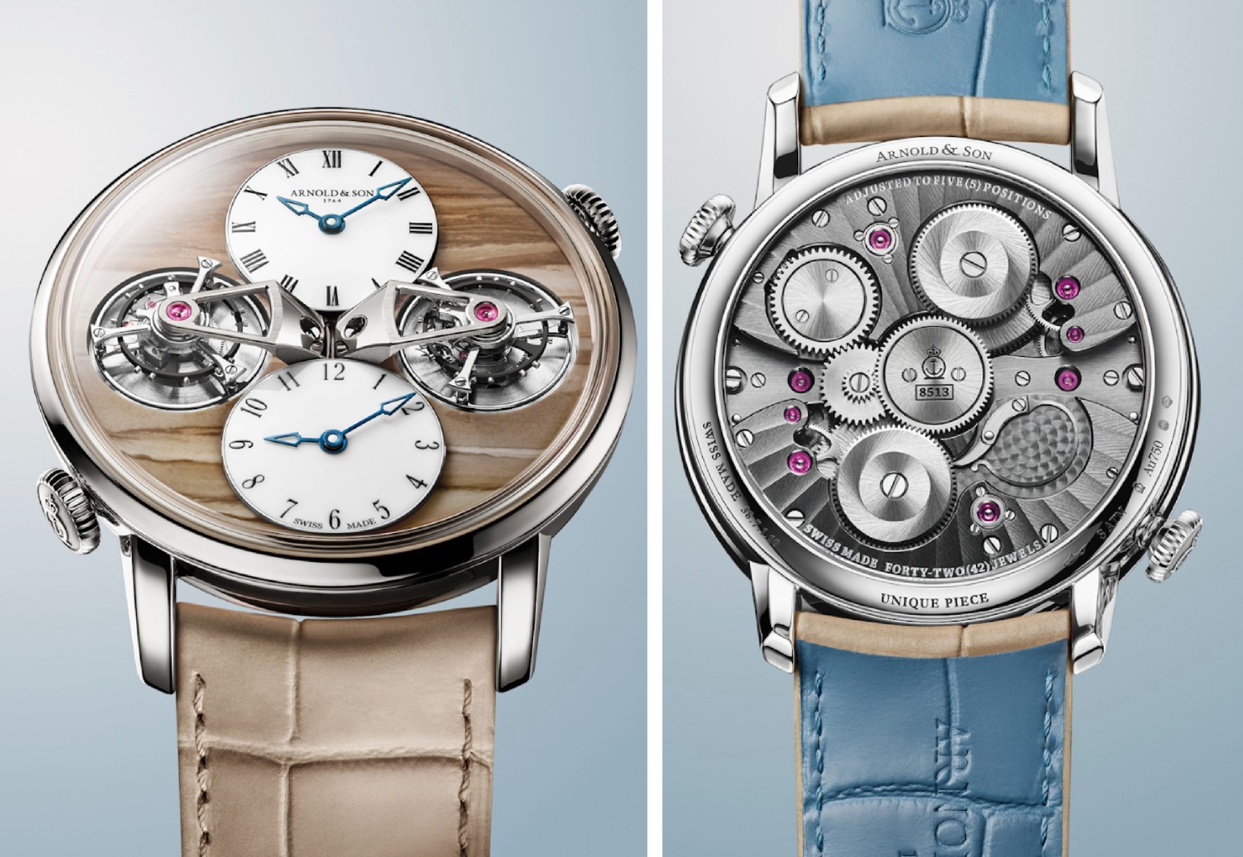 Questo esemplare unico è dotato di due tourbilon volanti, due anche i quadranti simmetrici in opale bianco che mostrano l’indicazione del tempo sui due fusi orari: alle 12 l’ora locale con indici in cifre romane, alle 6 l’ora di riferimento con indici in numeri arabi; entrambi i quadranti sono autonomi e sono regolabili con la corona a ore 2 e a ore 7 quella del GMT. Il movimento è il calibro A&S8513, sviluppato e decorato a mano dalla Manifattura Arnold & Son (ha due treni di ruote, due bariletti per la riserva di carica di 90 h; i ponti sono in oro, smussati e lucidati, la finitura è a Côtes de Genève, raggi di sole, perlage, a chiocciola per i bariletti dotati di un ampio “cliquet” che ne garantisce la tensione uniforme).