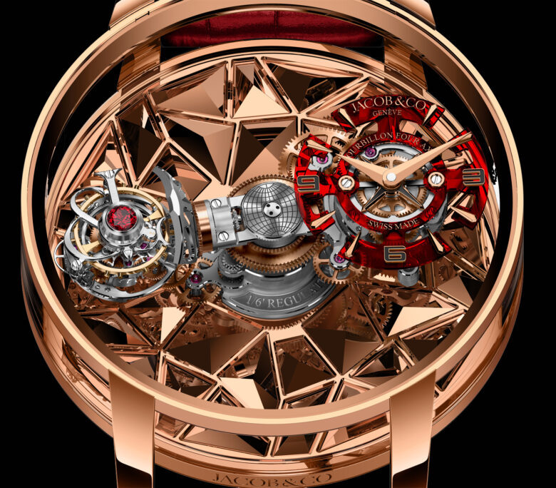 Sin dalla sua fondazione nel 2023, Jacob & Co ha presentato l’Astronomia Triple Axis in cui lo scappamento a tourbillon ruotava velocemente, la versione attuale, grazie alla diversità fra i movimenti delle gabbie, dà vita a una danza armoniosa che focalizza l’attenzione sui particolari di questo capolavoro. La cassa in oro rosa, diametro 47 mm (spessore 27 mm) è protetta da cristallo di zaffiro non solo sul fronte e sul retro, ma anche sulla carrure. Il movimento è il Calibro JCAM54 a carica manuale realizzato da Concepto. Come da tradizione in questa collezione l’orologio non ha la corona di carica e messa all’ora, ma due piccole chiavi pieghevoli alloggiate sul retro. Sul quadrante scheletrato indici rossi 5N applicati e lancette Dauphine in oro rosa. Il cinturino è in alligatore rosso con fibbia pieghevole in oro rosa.